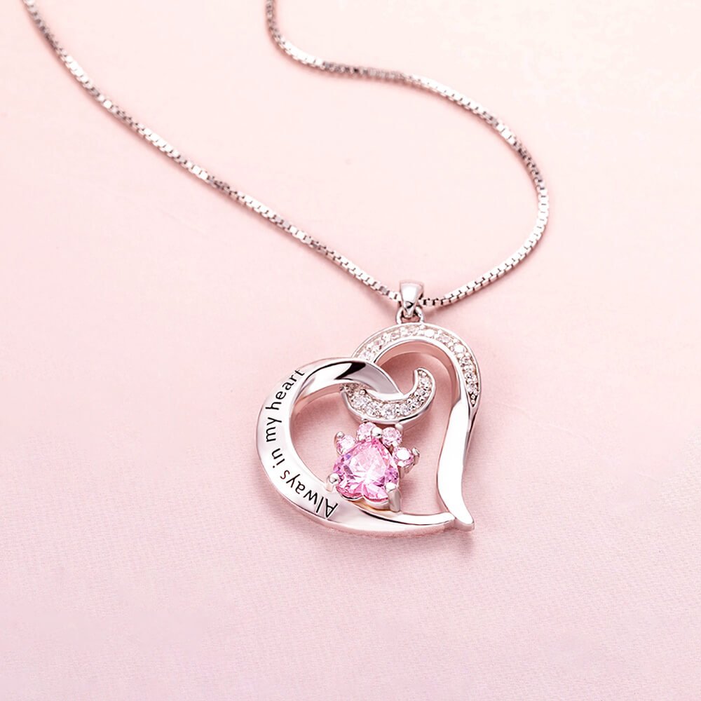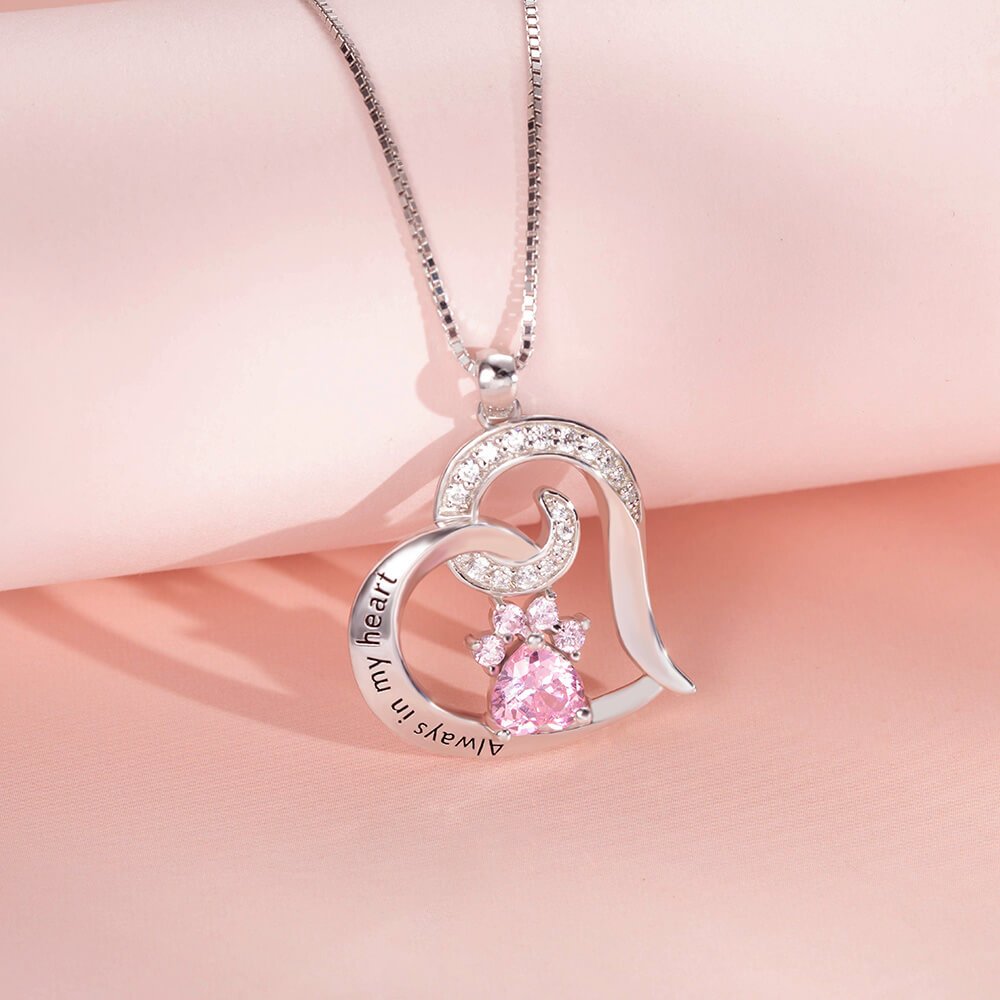 •This necklace by Callie emphasizes the pet footprint birthstone and words engraved on the pendant, creating a memorial and delicate look, memorizing the sweet moment with your pets. Beautifully embellished with sparkling crystals on the top of the heart shape adds the necklace a glittering tone.