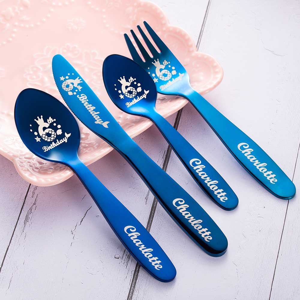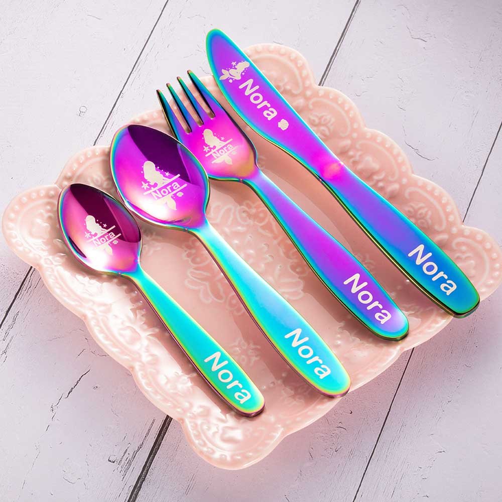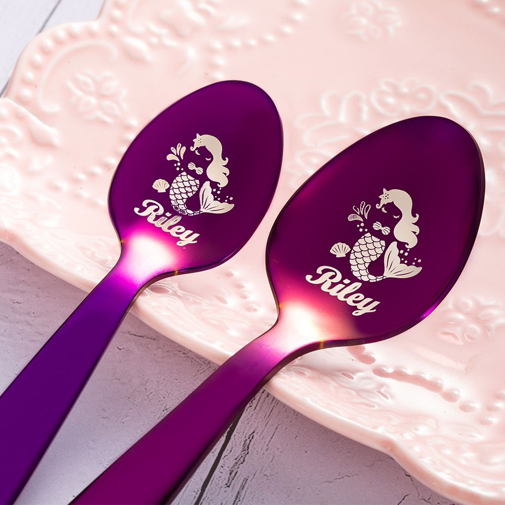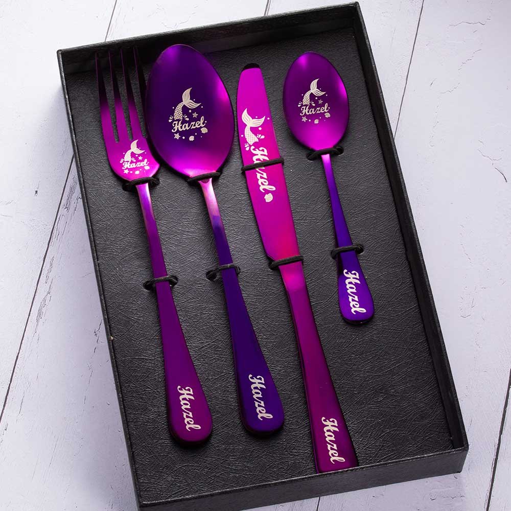 The tableware can be customized with any name or word with a limit of 10 characters. In addition, you can also choose your favorite mermaid pattern and the colour of the cutlery. We offer a total of two options, child-size, and adult size.