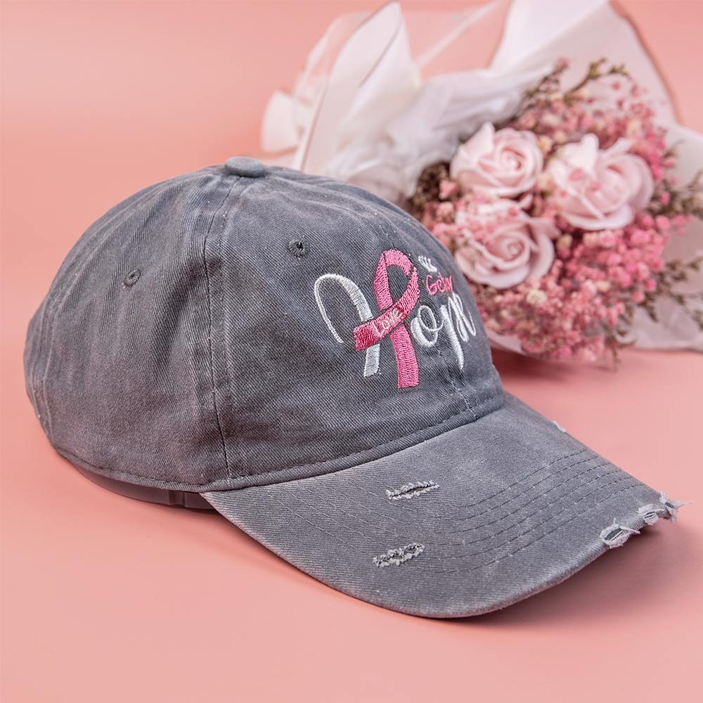 Unisex cap with twill ripped holes. The front of the hat can be customized with breast cancer-related patterns. The pattern combines elements of HOPE+pink ribbon+crown+name+SLOGAN.