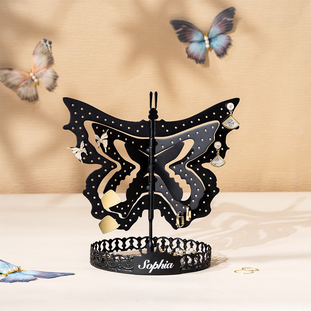 • The Inspiration of Butterfly Jewellery Organizer: The butterfly is considered a symbol of femininity, representing mystery, elegance, independence, and freedom. This vintage-style jewellery stand is made in the form of a butterfly with its wings spread. When you unfold the wings, it becomes three butterflies, symbolizing the growth of a woman through the process of transformation. The crown on the bottom can be customized with a name, representing that every woman is their queen, making it the perfect gift for women.