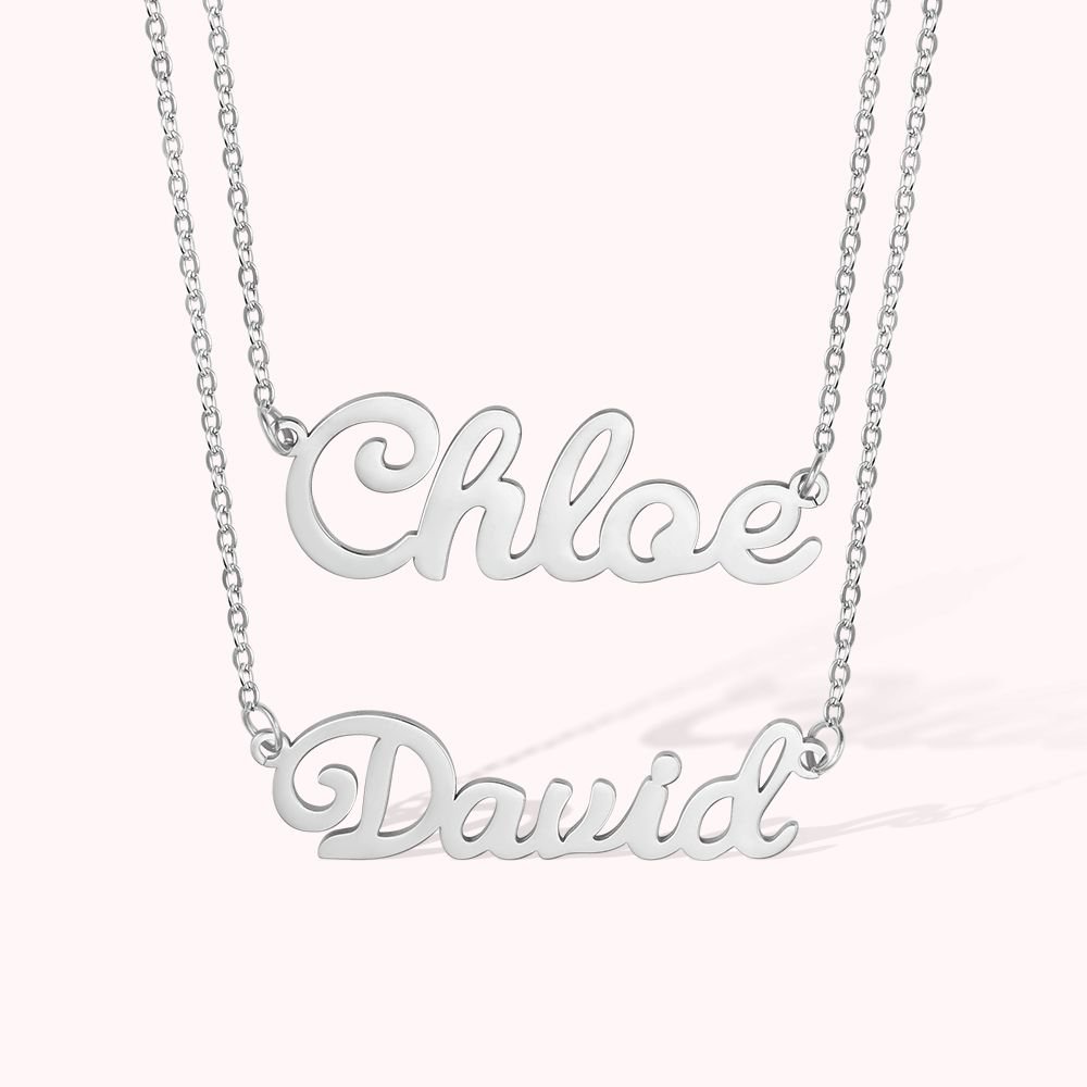 This custom double layered name necklace, this necklace has two styles to choose from, style 1 is a double-layered name necklace consisting of two chains, and style 2 has a double-layered name connected by a heart in the middle. You can customize the names of couples, sisters, friends, family members, etc, representing the intimate relationship between two people, suitable for you and your lover, to express love for each other, it is a meaningful necklace.