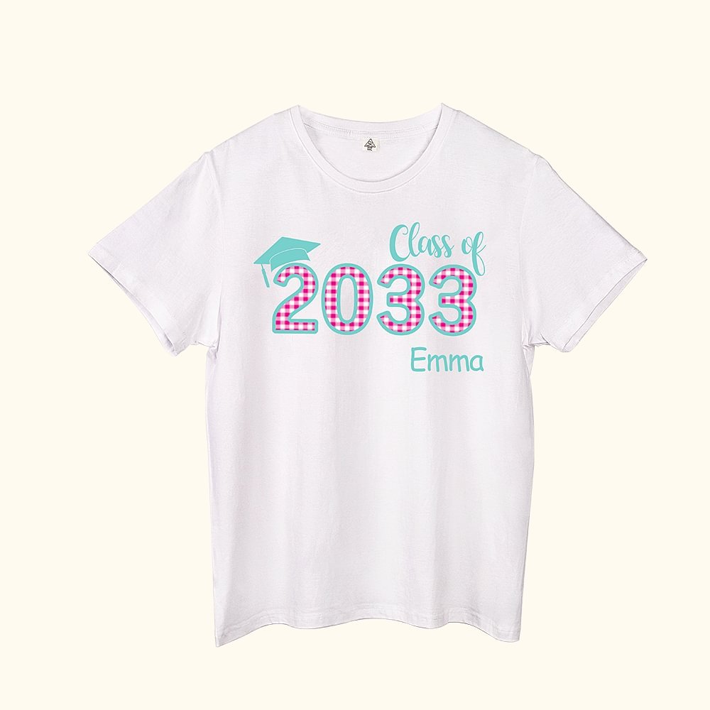 100% cotton, pure white, the colour of the pattern on each T can choose Pink, Grey, Blue, Green, Turquoise, Purple, Orange, Black. The colours of the text are Red, Pink, Turquoise, Orange, Yellow, Green, Navy blue, Blue, Purple, Black. X, XL, 2XL three sizes for your choice. This T-shirt allows children to print their handprints every year until graduation, customizing their name and graduation date.