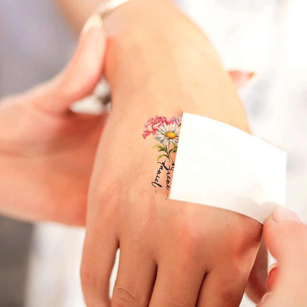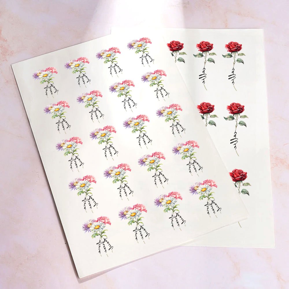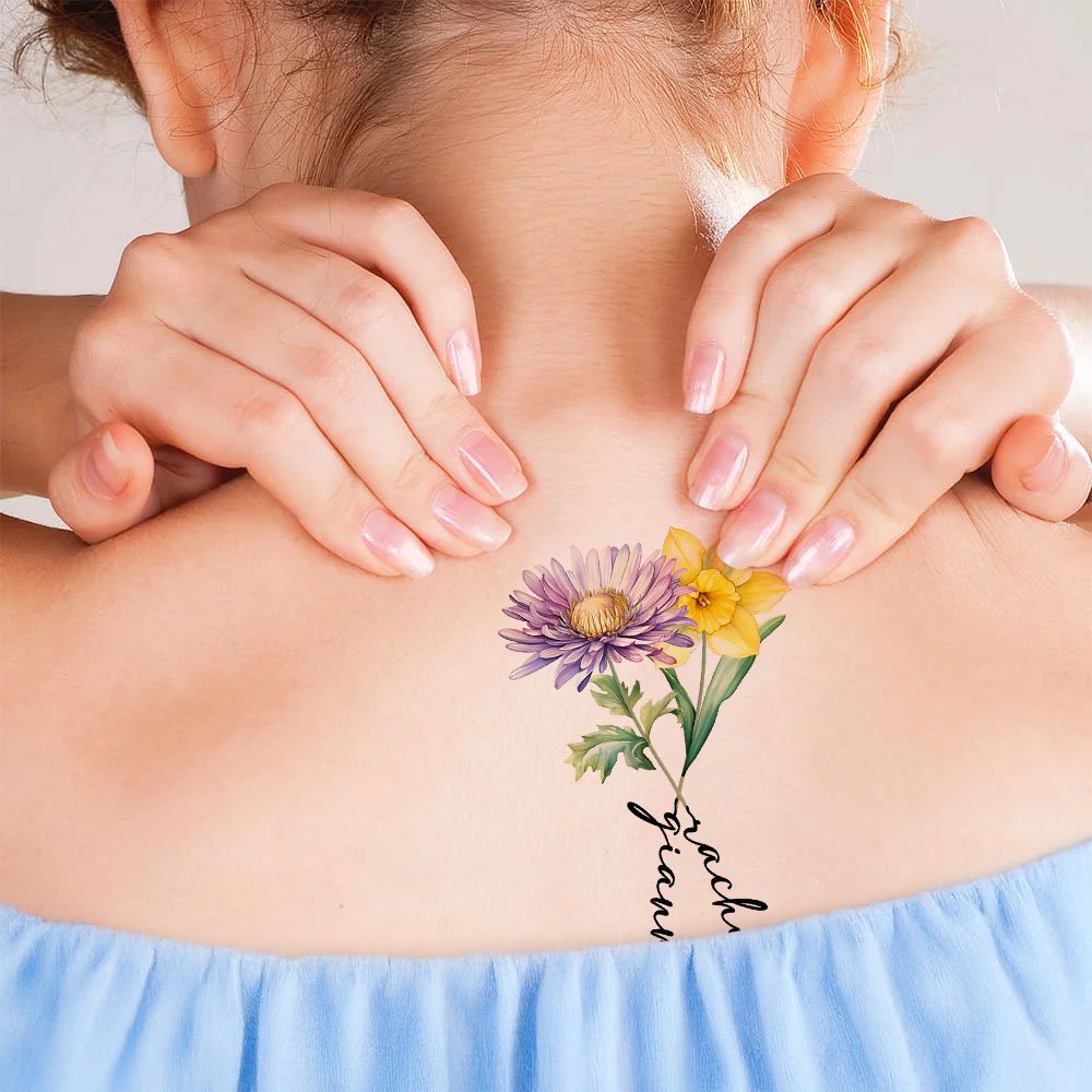 This is a bouquet of your loved one's birth flowers, offering up to 24 colourful birthday month flowers to choose from, full of elegance and vitality, each representing a special meaning, and you can also Personalise it with your name, so that you and your loved ones can resonate. This Personalised design gives each tattoo sticker a unique emotion and meaning.