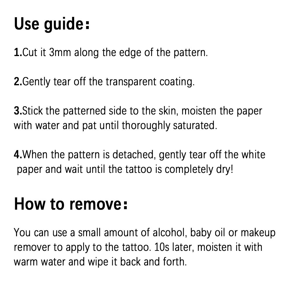 These tattoos can be applied to various parts of the body, such as arms, legs, or shoulders, serving as daily accessories to showcase your personality. They are perfect as temporary decorations for parties or photo shoots, adding highlights to your look. If you want to remove them, simply use a small amount of alcohol, baby oil, or makeup remover directly on the tattoo. After 10 seconds, moisten it with warm water and wipe it back and forth.