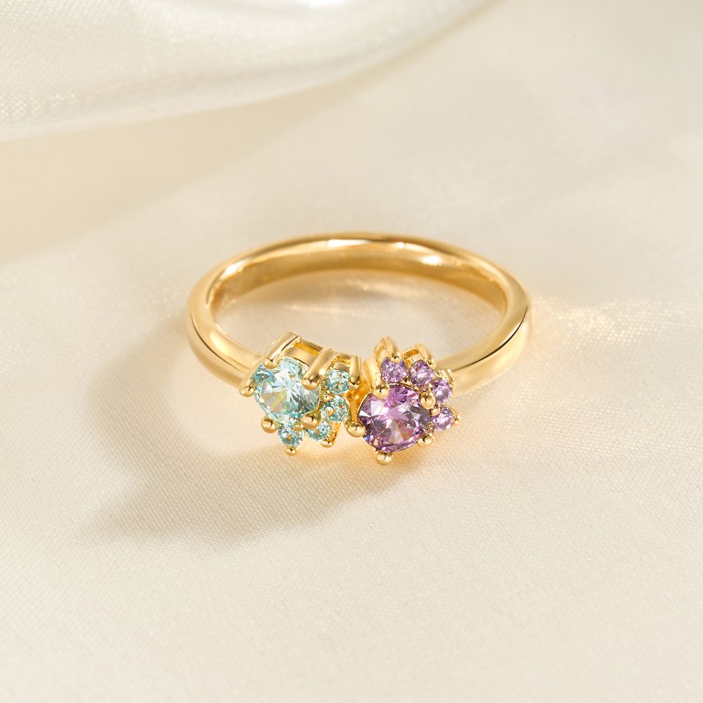 This exquisite ring features paw prints and is set with 1-5 birthstones, a profound tribute to your beloved pet. Available in platinum, yellow gold, and rose gold, it's more than just a piece of jewellery; it's a precious memory that lets you cherish the image of your beloved pet forever.