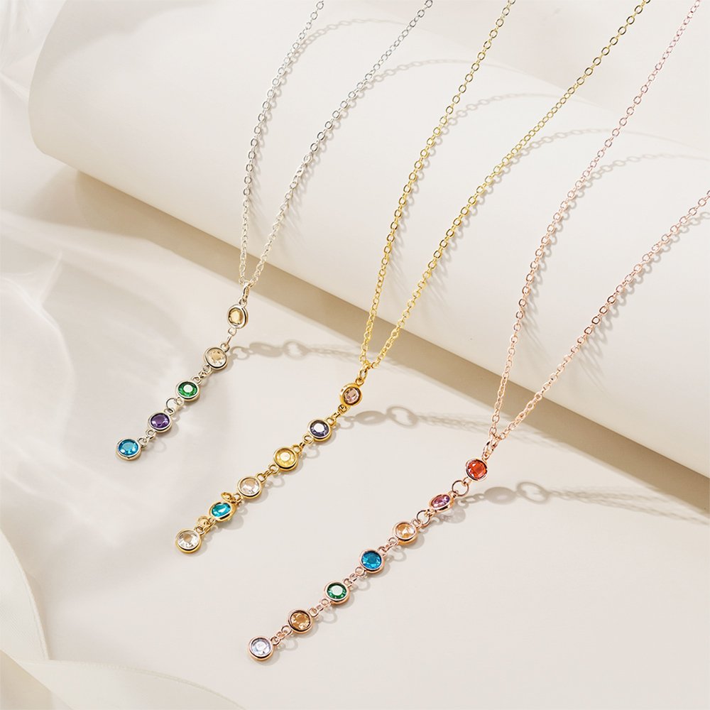 This necklace blends minimalist design with personal customization. Birthstones are chosen based on your or your family's birth month, adding colour to the design and symbolizing loved ones’ unique identities.