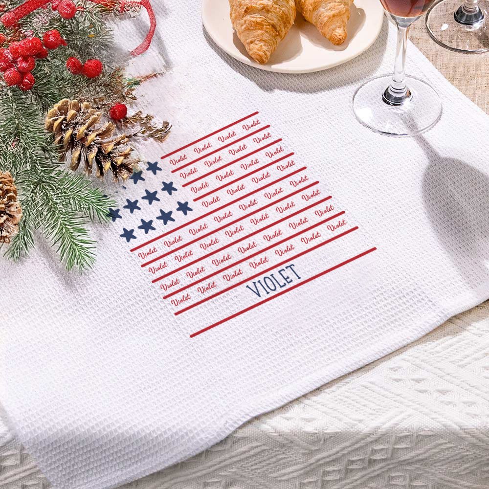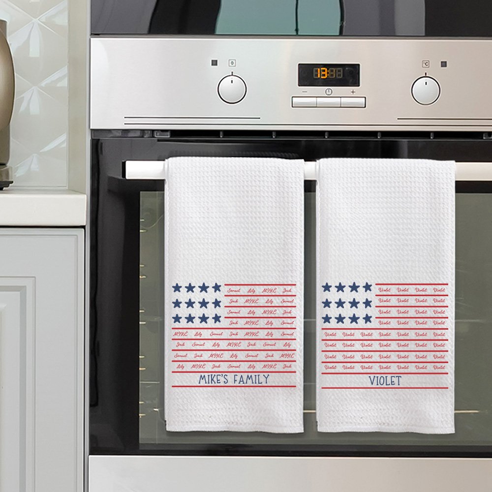 A standout feature of these flour sack towels lies in their American flag design, crafted from surnames, text, and star-and-line motifs. With space to customize 1–8 names, they become one-of-a-kind pieces for families or thoughtful gifts for specific recipients, blending personalization with patriotic flair.