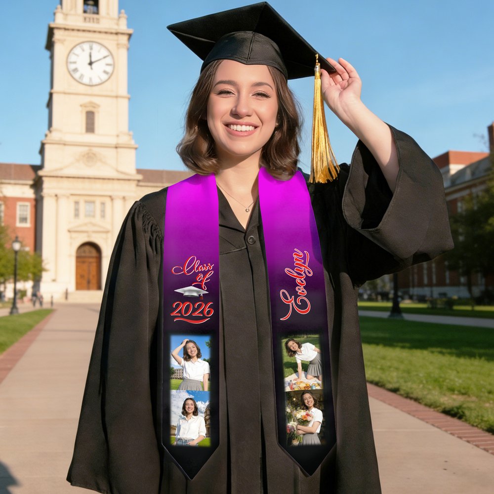 Our sash features a gradient colour-blocking design, offering a wide range of colour schemes. It also supports photo upload customization, including 2/4-photo designs, creating the most eye-catching accessory to your graduation gown. You can also customize the sash with your name and graduation year, making it more personalised and perfectly showcasing your personality and achievements.