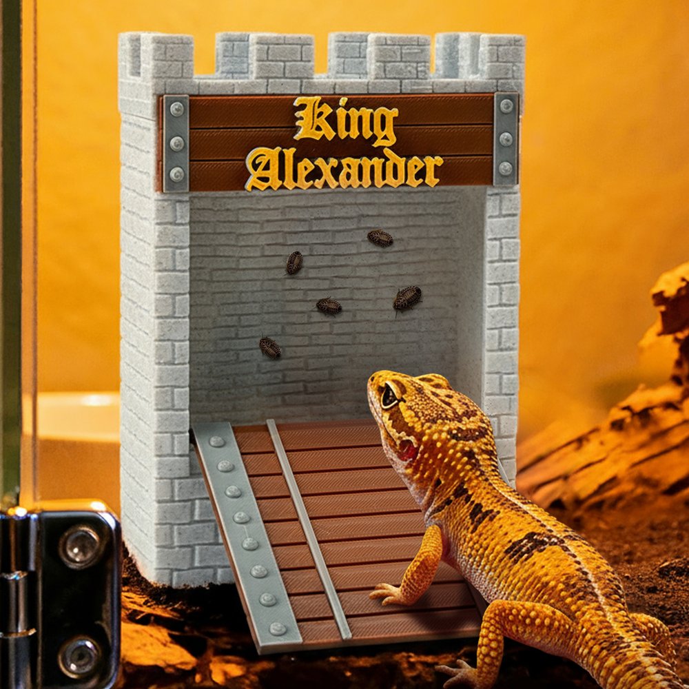 This castle-themed feeder features simulated castle wall textures and a drawbridge-style entrance, creating a personalised reptile feeding dish with Gothic Revival flair. Customize the feeder with your own text, blending artistic appeal with practical functionality to make every feeding ritual special for your pet.