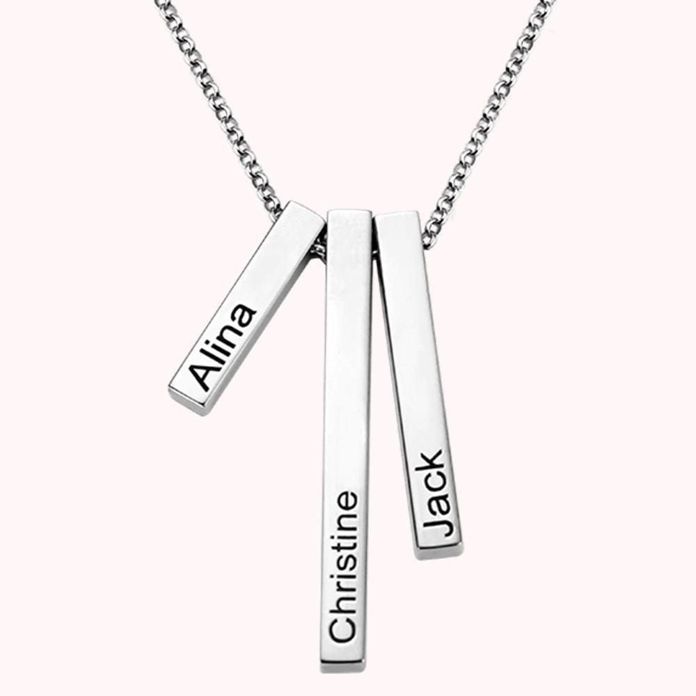 •The industrial and modern style necklace by Callie is conveying the meaning of confidence and individuality. Bars cuts refract the incoming light brightly. This dainty necklace shows three stereoscopic bars in different lengths. The simple but stylish design of bars indicates the significance of three special words or names for the wearer. Girls are going to love it as it suits effortlessly for all kinds of occasions while it remains unique.