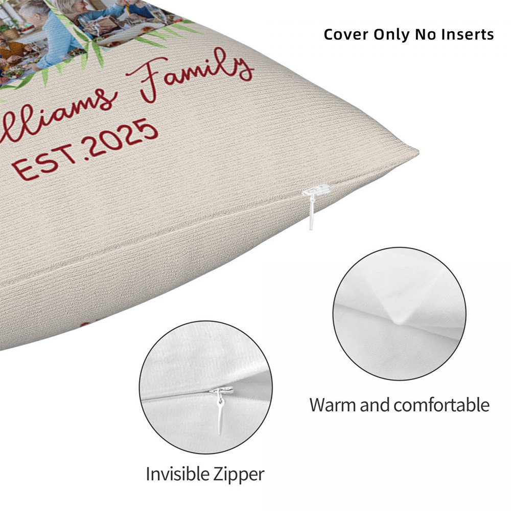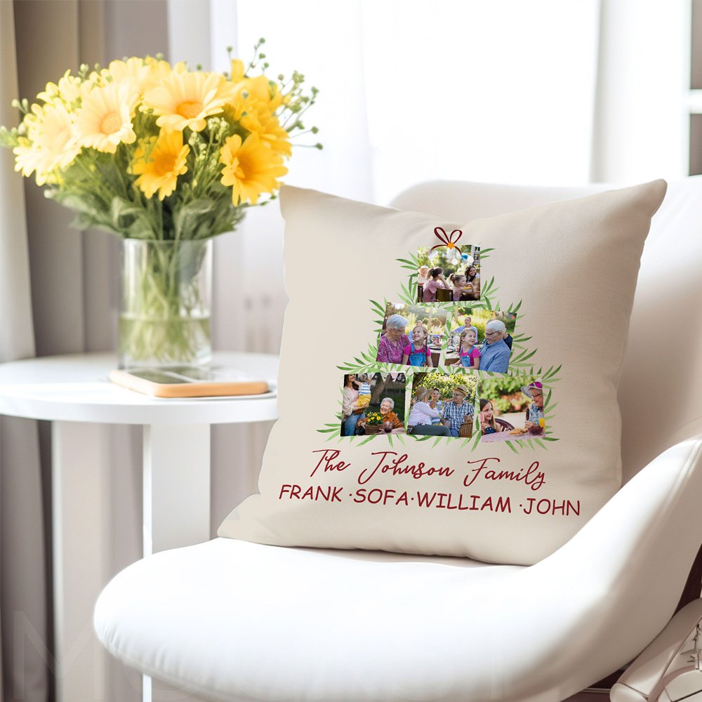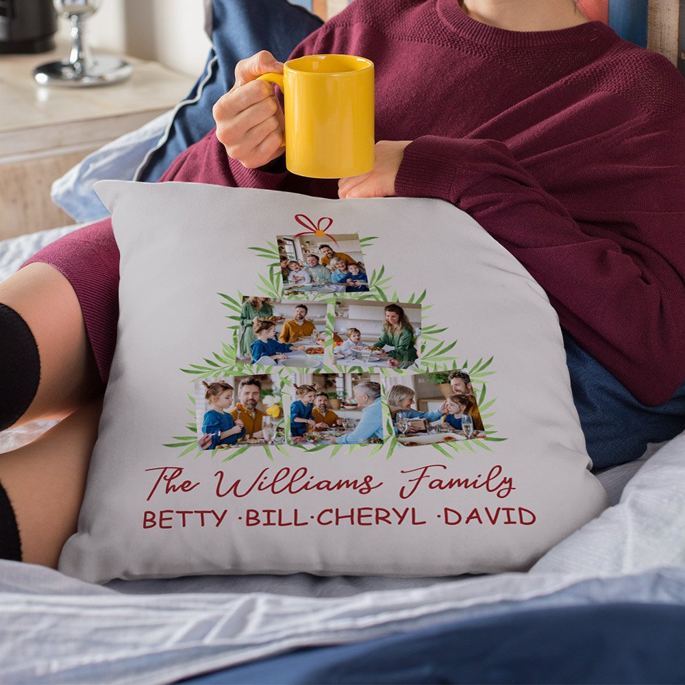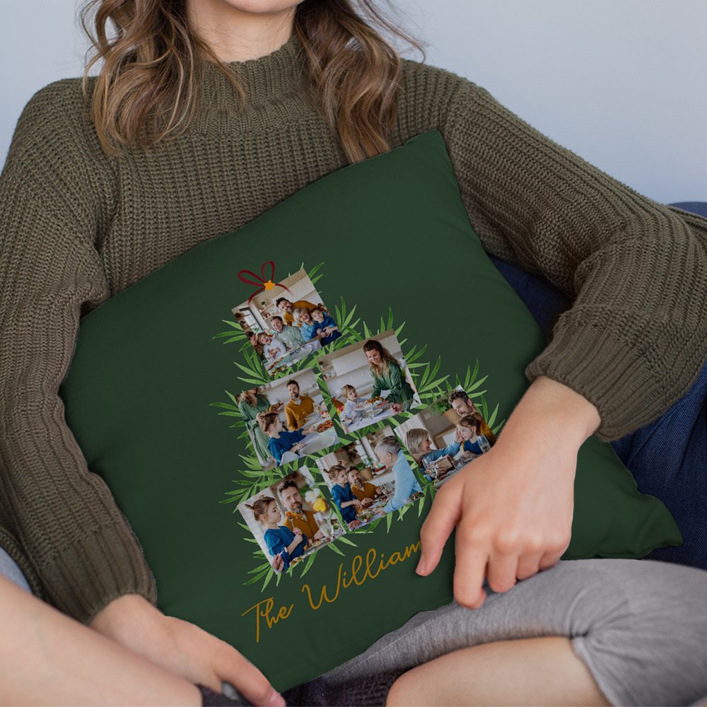 This pillow cover is bright and colourful, and it is very eye-catching with 6 photos collaged into the shape of a Christmas tree, perfectly capturing the spirit of the holiday and the moment of gathering, creating a joyful atmosphere. You can Personalise the text on it to create a unique home decoration.