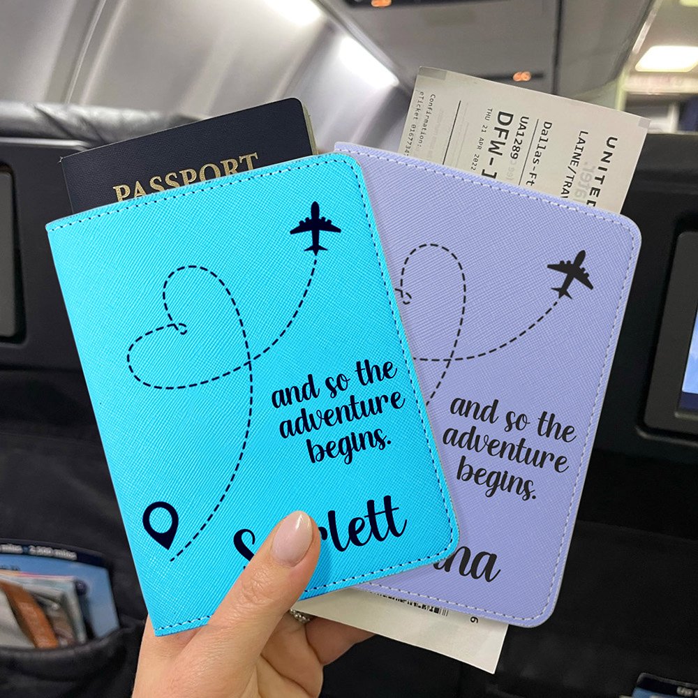 Our passport holder and luggage tag feature a charming airplane heart route design with a start point icon, plane illustration, and personalised text. Adding your name makes them uniquely yours, showcasing your love for travel and adventure.