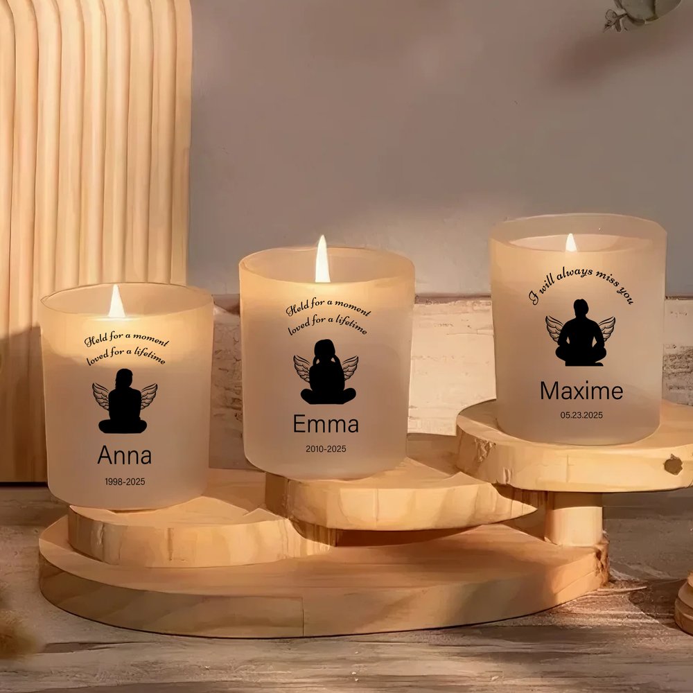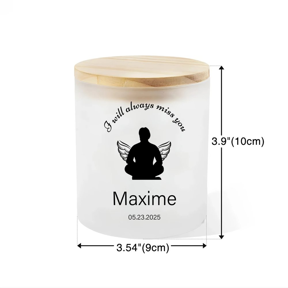 A silhouette of a figure outlines the memory, accented with angel wings symbolizing guardianship. Customize the title, name, and year on the memorial candle jar. The interplay of light and shadow creates a tranquil atmosphere, allowing every detail to carry the deepest remembrance of a loved one, creating a warm connection between memories and the present.