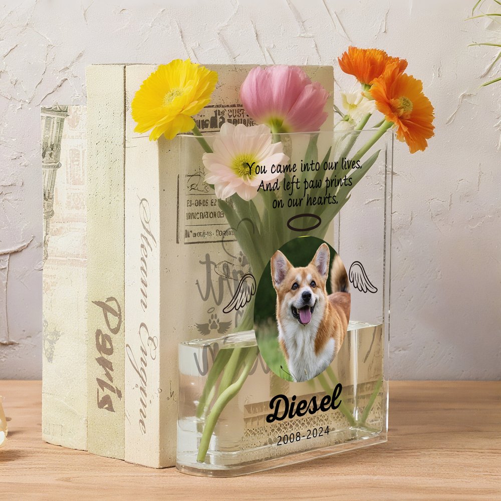 This unique book-shaped vase stands out with its touching tribute design. The front features delicate silhouettes of beloved pets—cats, dogs, rabbits, horses—or you may Personalise it with a cherished photo of your companion. Adorned with angel wings and a halo, the design symbolizes eternal love and precious memories. The back offers 12 heartfelt text options to express your deepest emotions. It also can be customized with your pet's name, creating a one-of-a-kind memorial that brings comfort and strength.