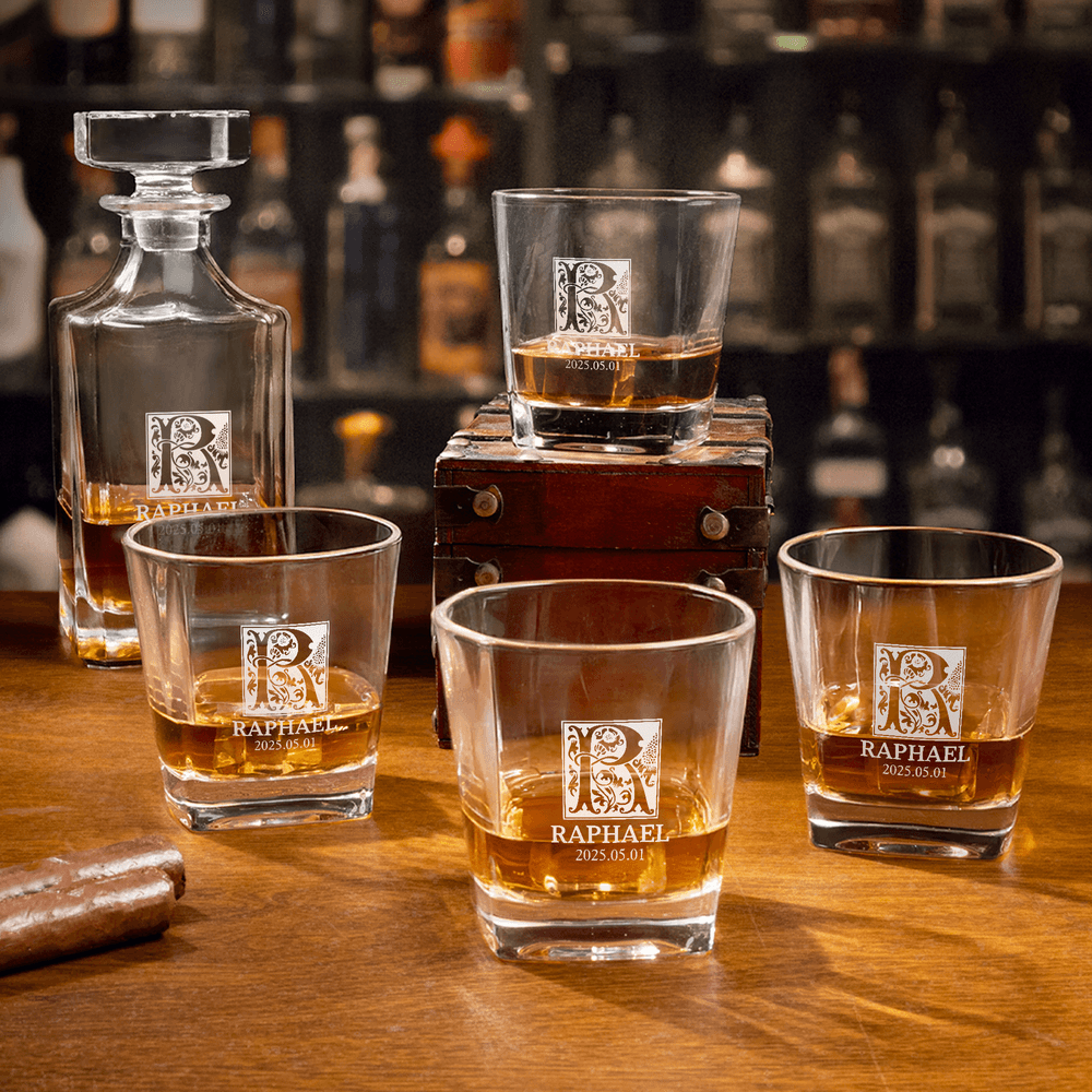 You can have initials, emblems like coats of arms, or other meaningful designs laser-engraved on the high-quality glass decanter and glasses, as well as on the pine wood box. This allows you to create a set that's uniquely tailored to your taste or that of the recipient, turning it into a one-of-a-kind keepsake.
