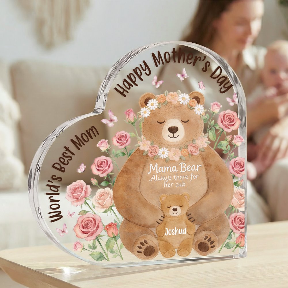 At the heart of this heart-shaped acrylic plaque lies an adorable family of bears. A gentle mama bear cuddling her cubs, surrounded by blooming roses and delicate butterflies. Printed with "World's Best Mom" and "Happy Mother's Day," it can be personalised with the cubs' names. Every detail captures the romance of Mother’s Day, bringing your unique love to life.