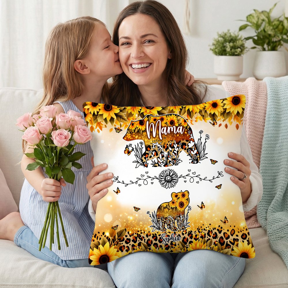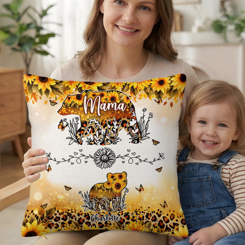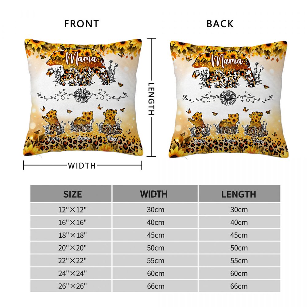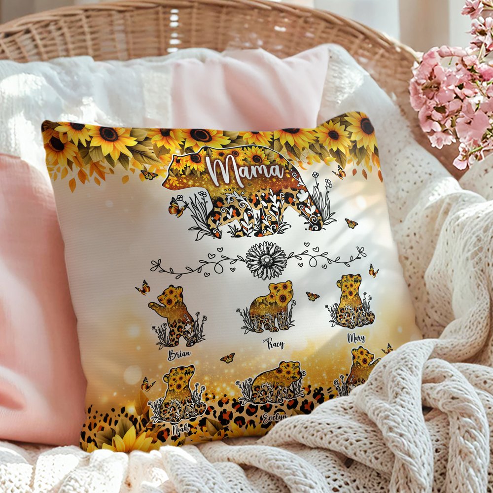 This pillow case features an adorable mother bear and 1-6 cubs, with golden sunflowers and leopard print patterns incorporated into their bodies, paired with lively butterflies, creating a bright yet wildly beautiful look. Personalised names can be added to the mother bear and below each cub, strengthening the sense of family and the theme of maternal love.