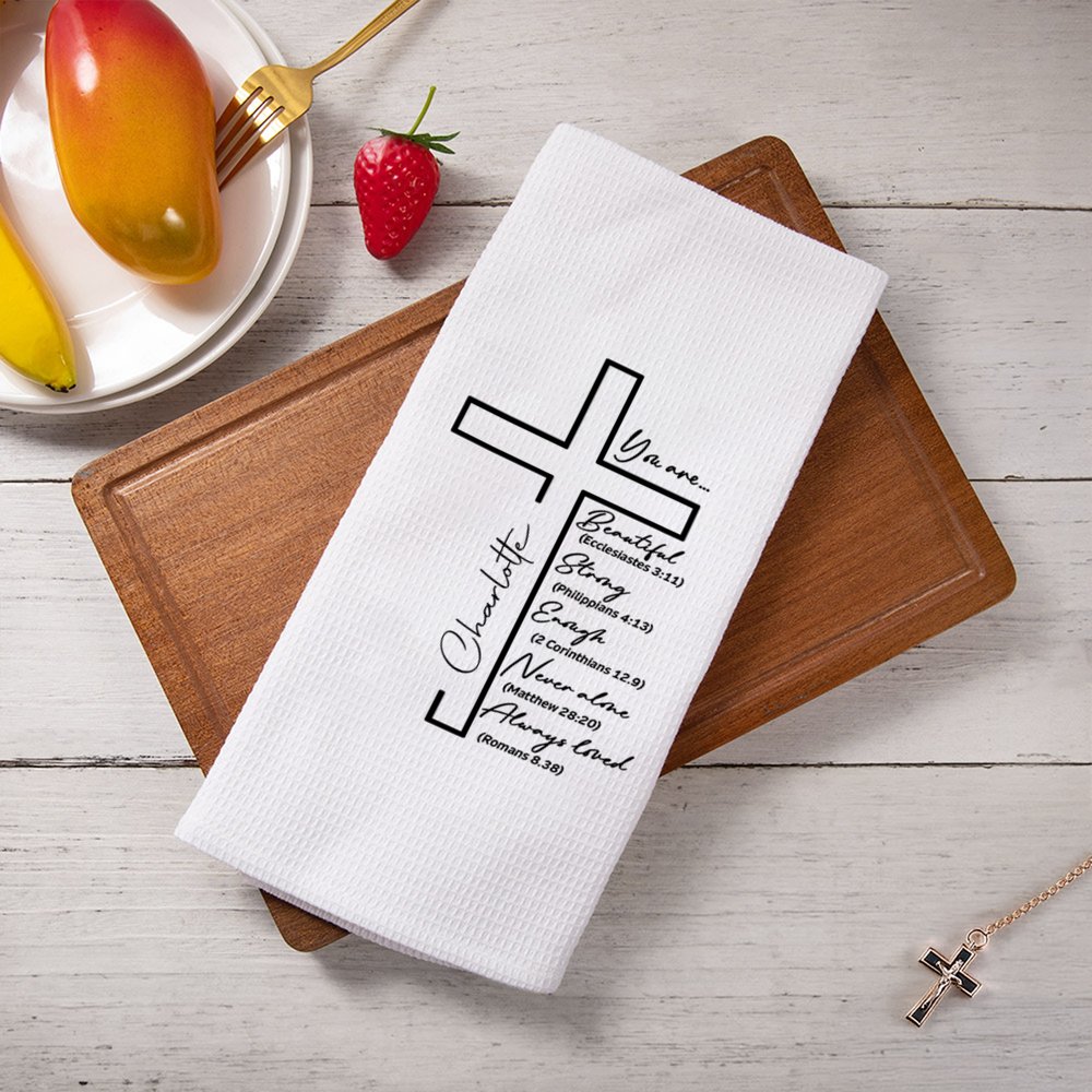 Serve as a tea towel placed beside teaware, adorning the table while providing convenient wiping. Hang a hand towel on kitchen hooks for easy access after washing hands. Function as a dishcloth for cleaning tableware, meeting basic cleaning needs. Additionally, the design featuring faith elements and personalised names doubles as kitchen decor—displayed prominently to add a unique style to any kitchen.