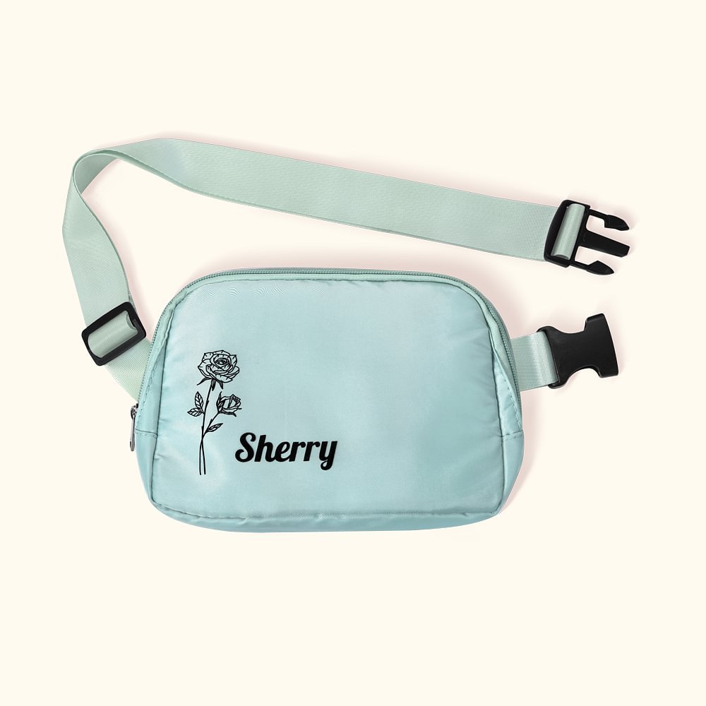 The waist belt bag is printed with a unique birthday flower pattern, which you can choose according to your birth month. You can also customize your name on it to make it even more unique. The waist belt bag has a very durable detachable buckle and an adjustable shoulder strap, so it can be used as a waist pack, chest bag, or crossbody bag. It can be easily and quickly adjusted to the desired length and held at the selected length without loosening.