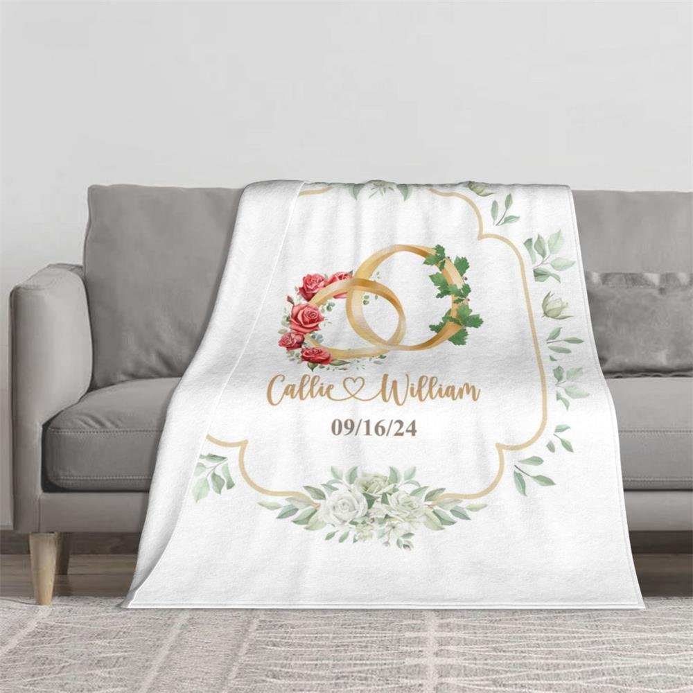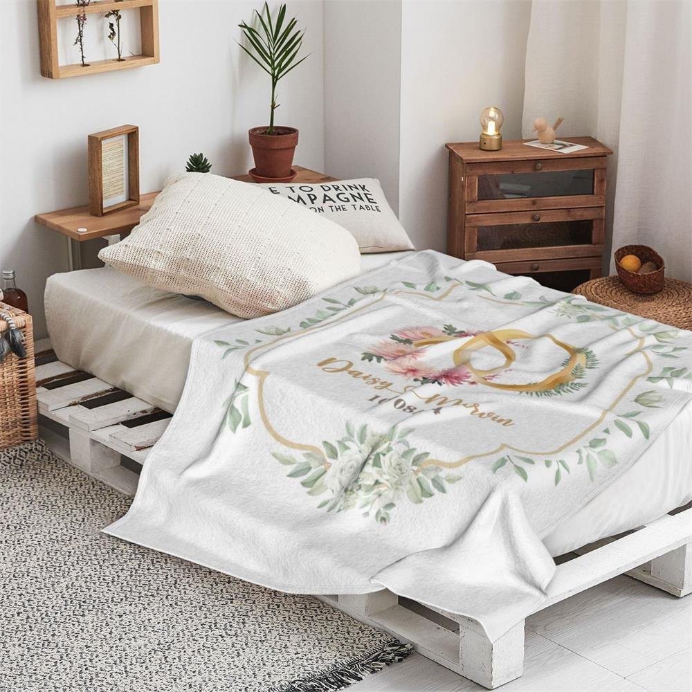 This blanket is printed with a tight-knit pair of rings, symbolizing the close bond between the bride and groom. Two rings are wrapped around the birth flower and the birth leaf. The birth flower represents the bride, the birth leaf represents the groom, and the combination of flowers and leaves represents good wishes for them. The blanket can also be customized with the names and dates of both parties to make it even more special.