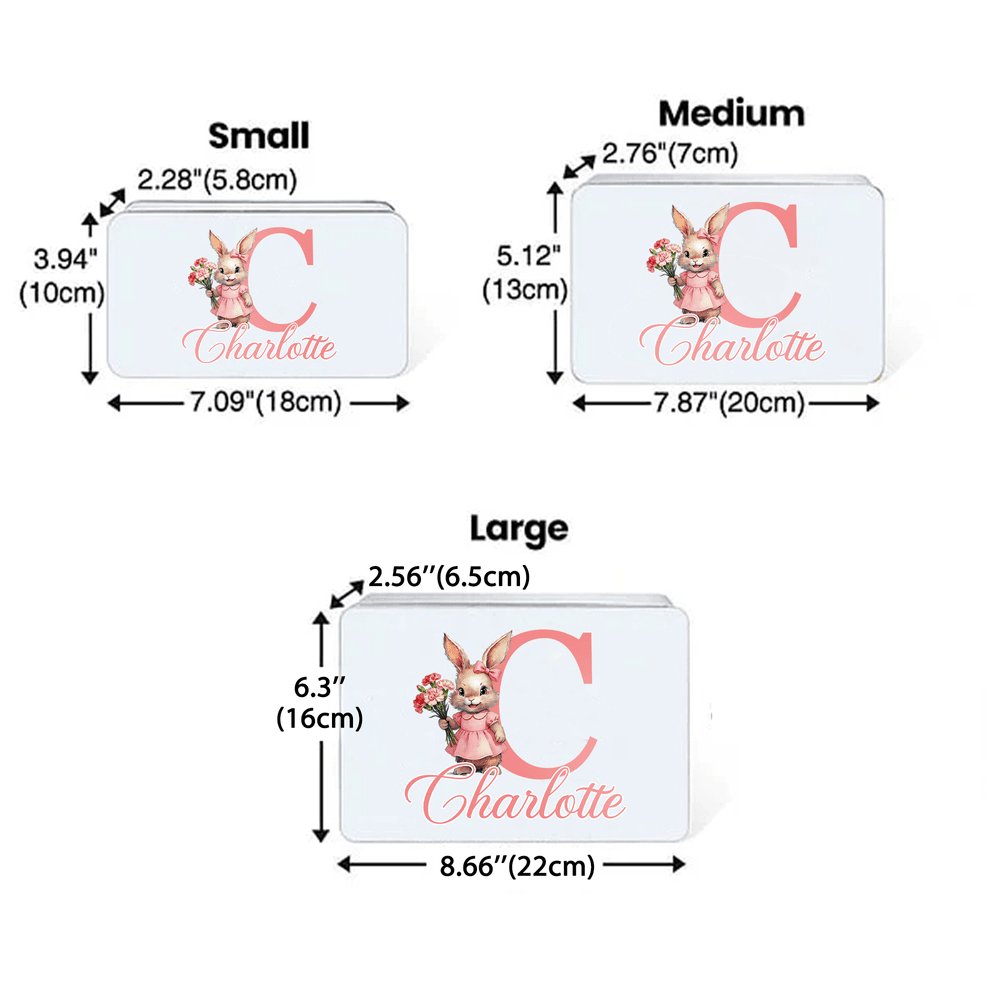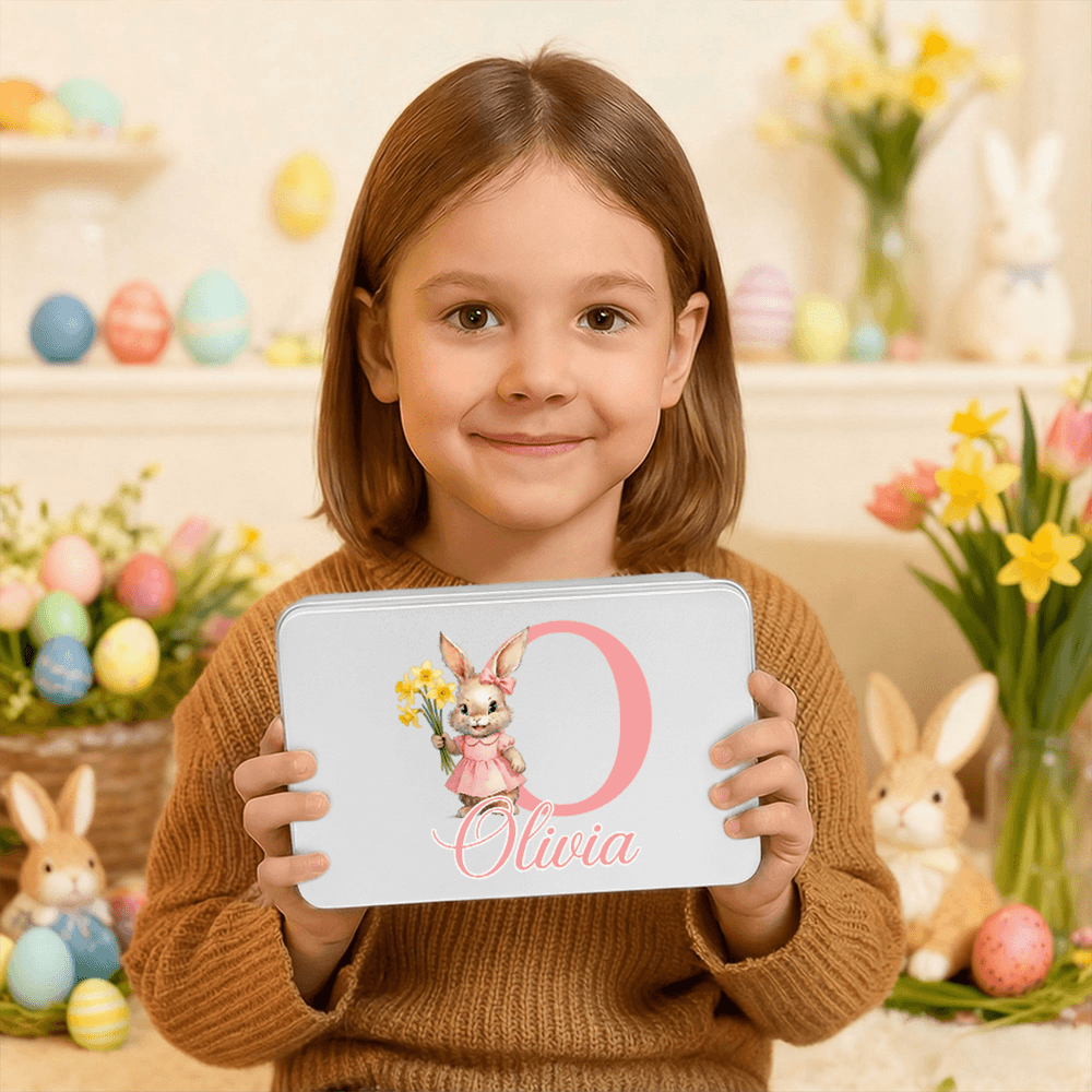 The Biscuit tin features a lively Easter bunny pattern on its surface, combined with customizable birth flower elements and the recipient's initials, creating a springtime fairytale ambiance. Making it not only a festive storage container but also a delightful decorative piece for a child's room.