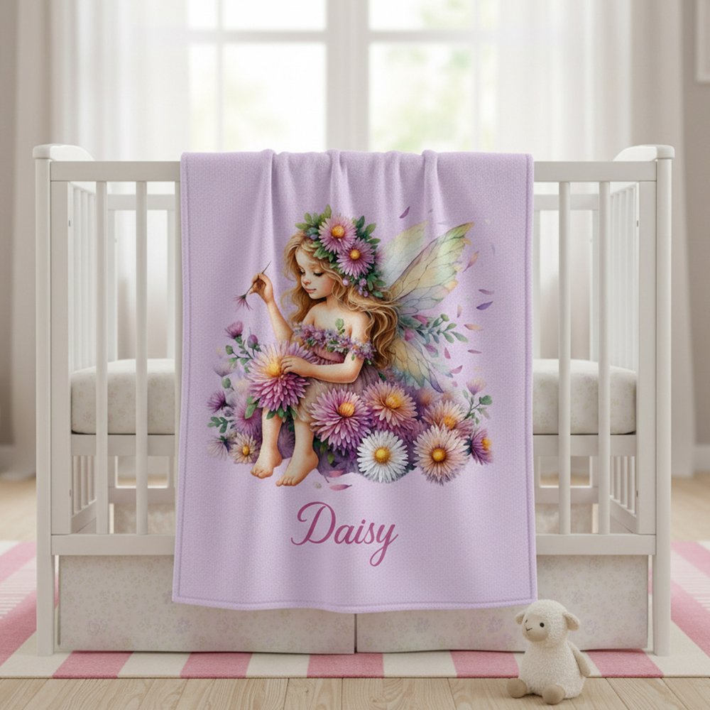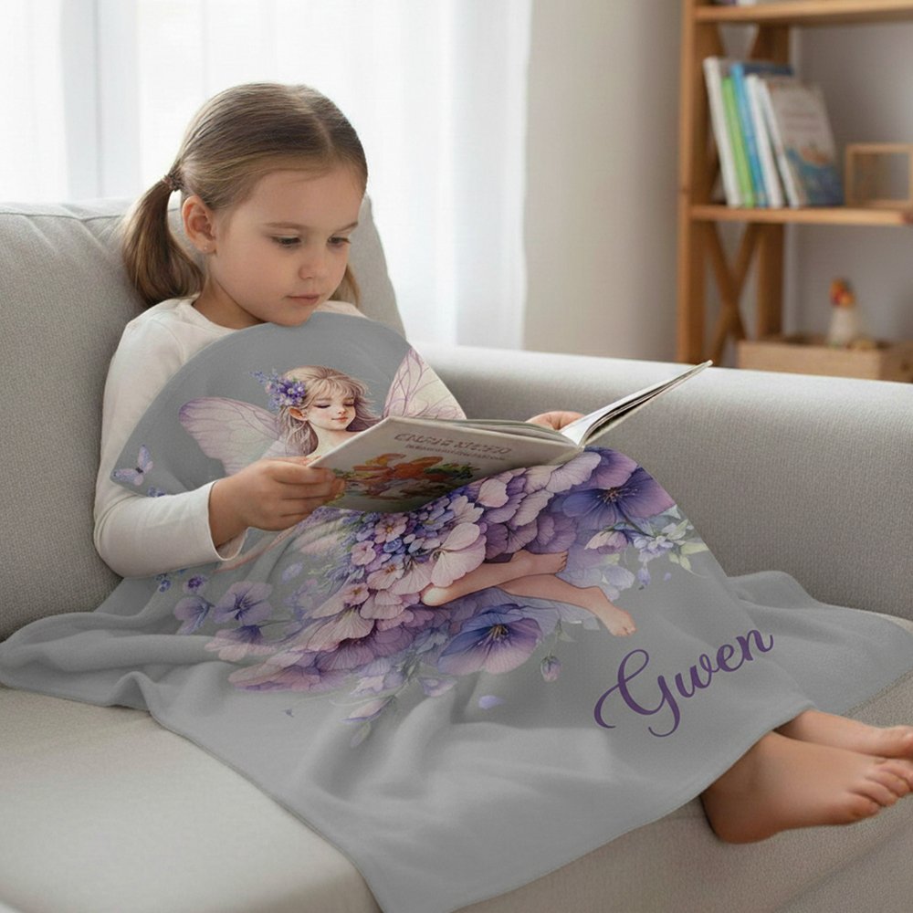 The blanket features a dreamy, watercolour-inspired design with a delicate flower fairy at its centre. The soft background creates a gentle, ethereal atmosphere, while the custom name in a flowing script adds a personal touch. The overall style is romantic and whimsical, resulting in a blanket that is both visually stunning and emotionally resonant for young dreamers.