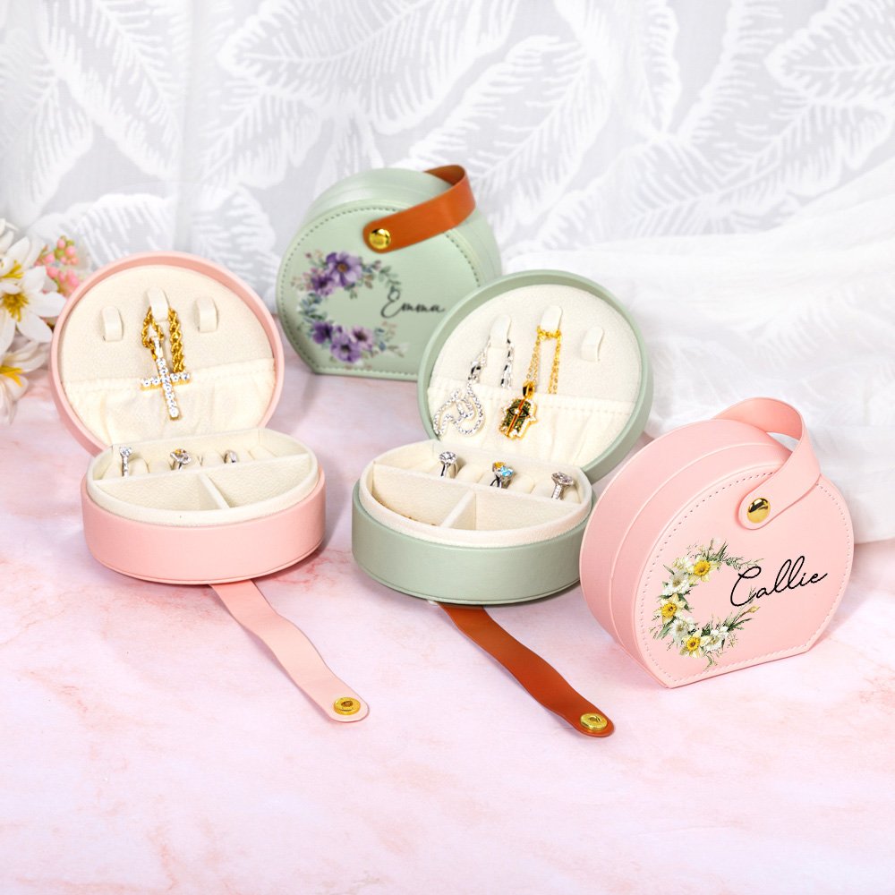 This jewellery case features a stunning, Personalised design. The exterior showcases a beautiful birth flower wreath, which adds a touch of nature's elegance. Alongside the wreath, the name is prominently displayed. This personalization makes the case unique to the owner, giving it a memorable and meaningful touch.