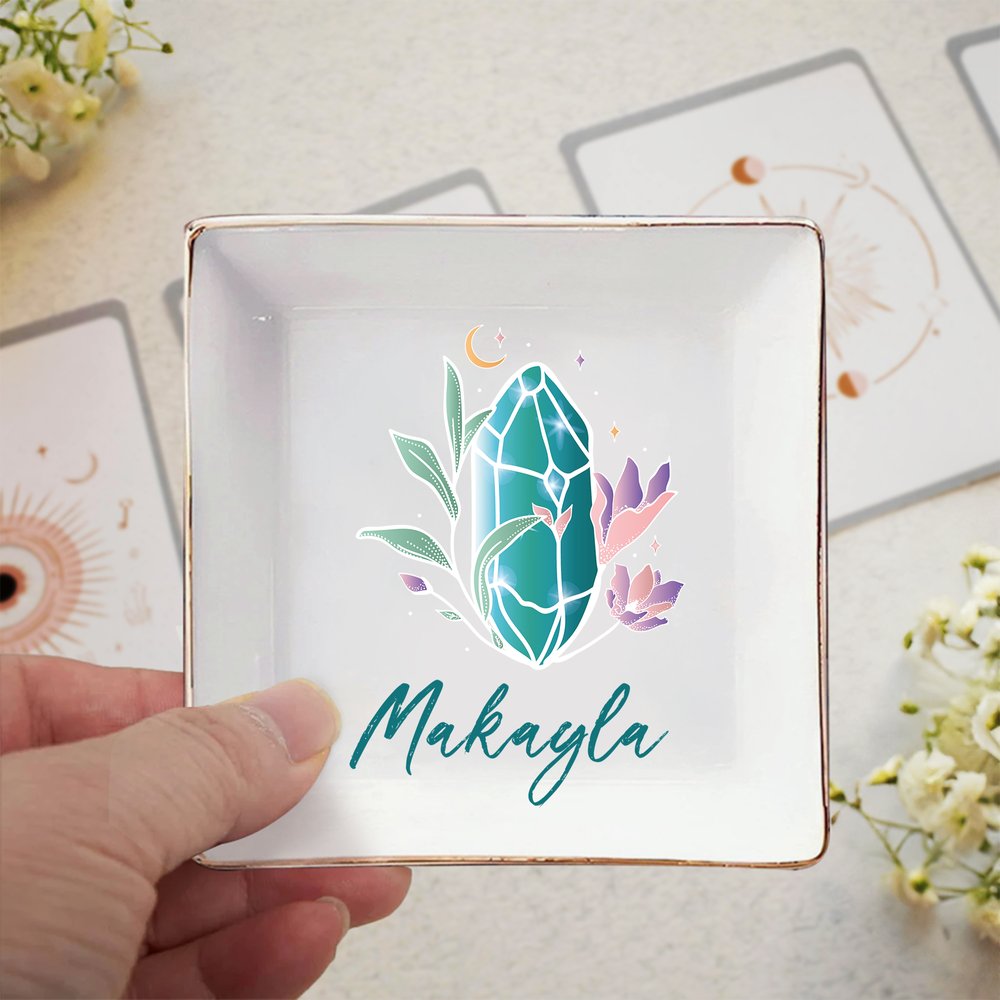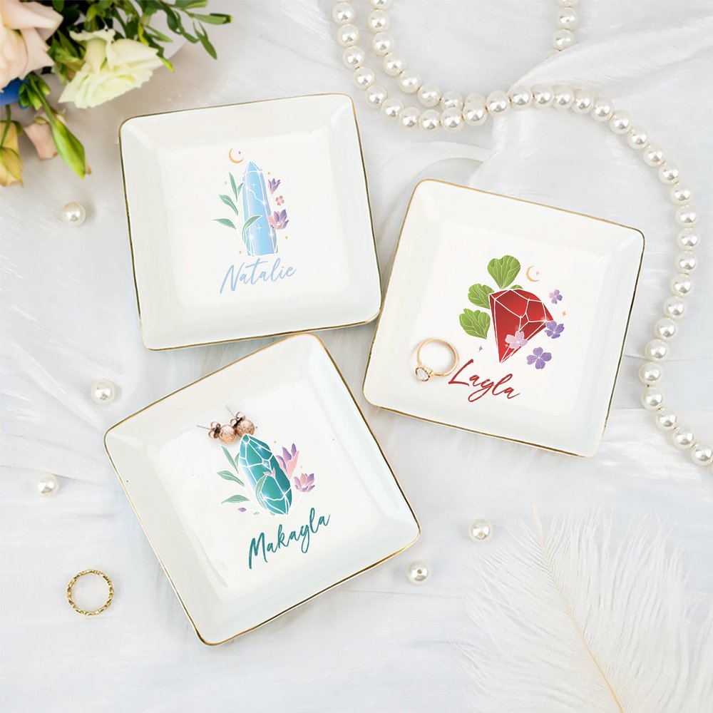 These jewellery dishes catch the eye with their elegant design and personalised customization options. Each plate is carefully painted with birthstone patterns in different colours and shapes, surrounded by stylized leaves and small flowers, as well as elements such as the moon and stars, creating a dreamy and sophisticated atmosphere. Each jewellery plate is printed with a unique name, making each plate a personalised work of art.