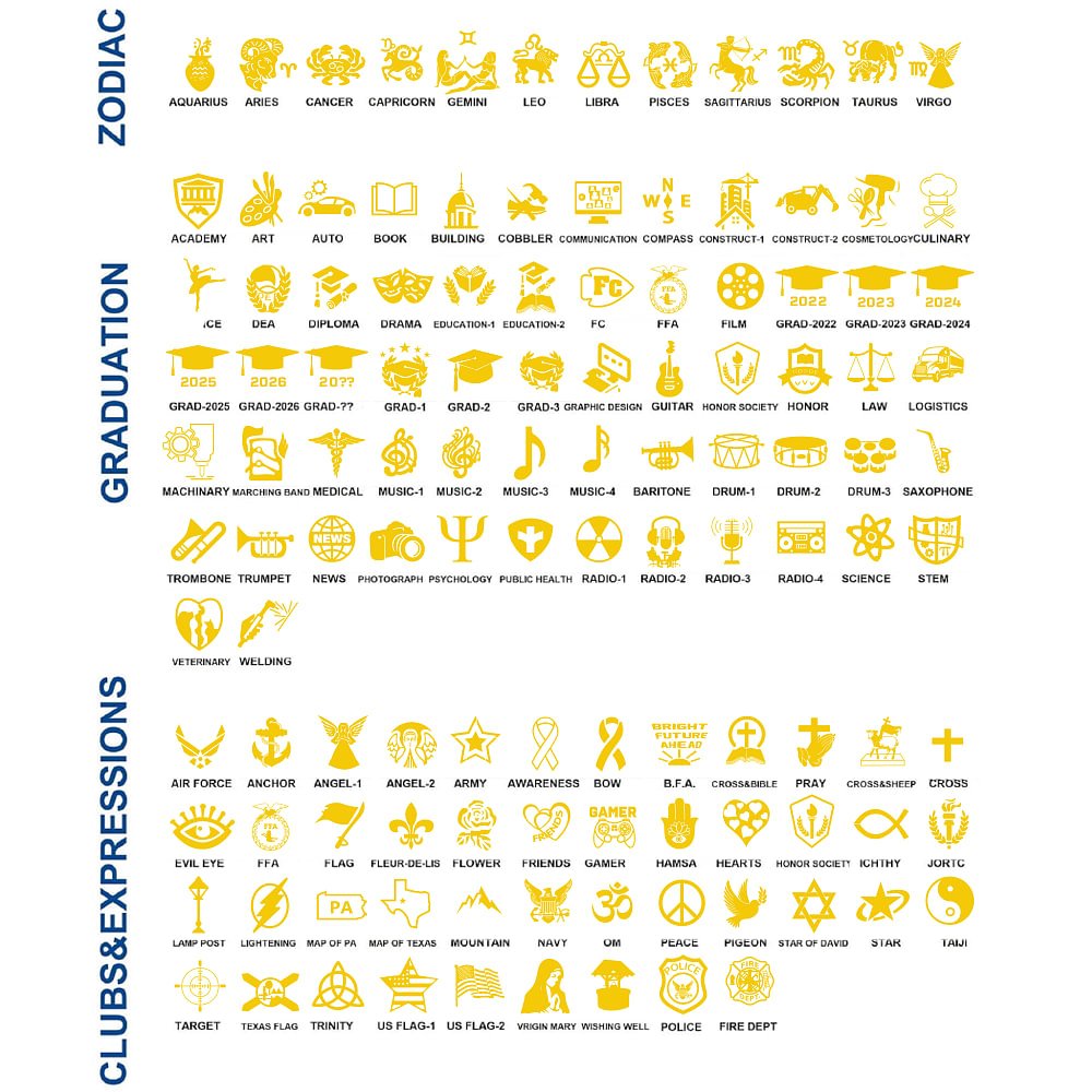 With over two hundred badge icons available, ranging from mascots, sports, zodiac, graduation, to club & expressions, you have a wide array of styles to choose from. Find the perfect emblem that represents your passions, interests, or extracurricular activities, creating a truly Personalised class ring design.