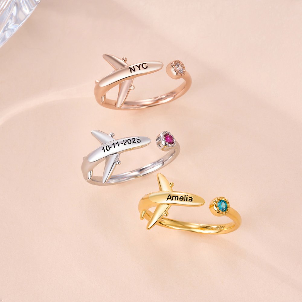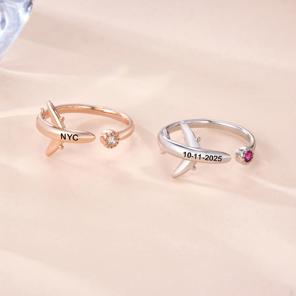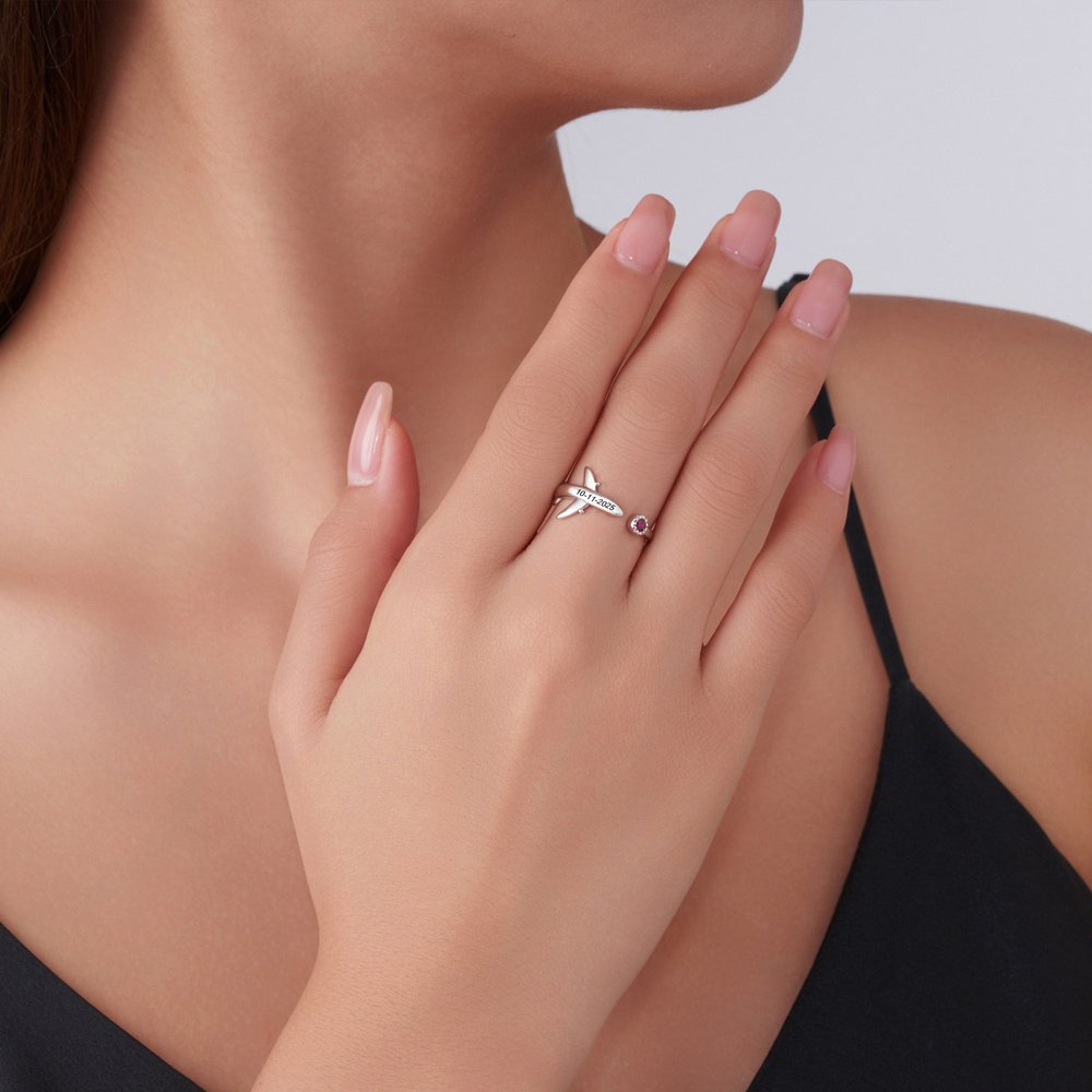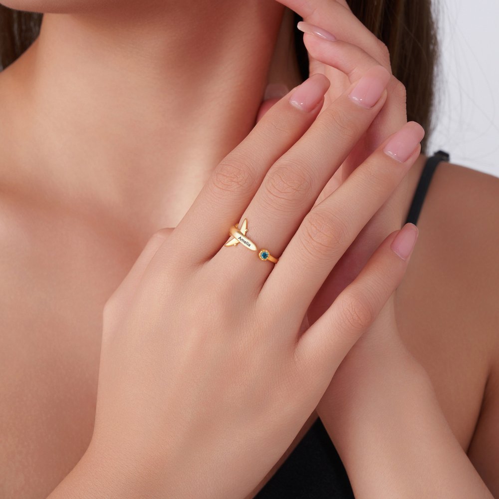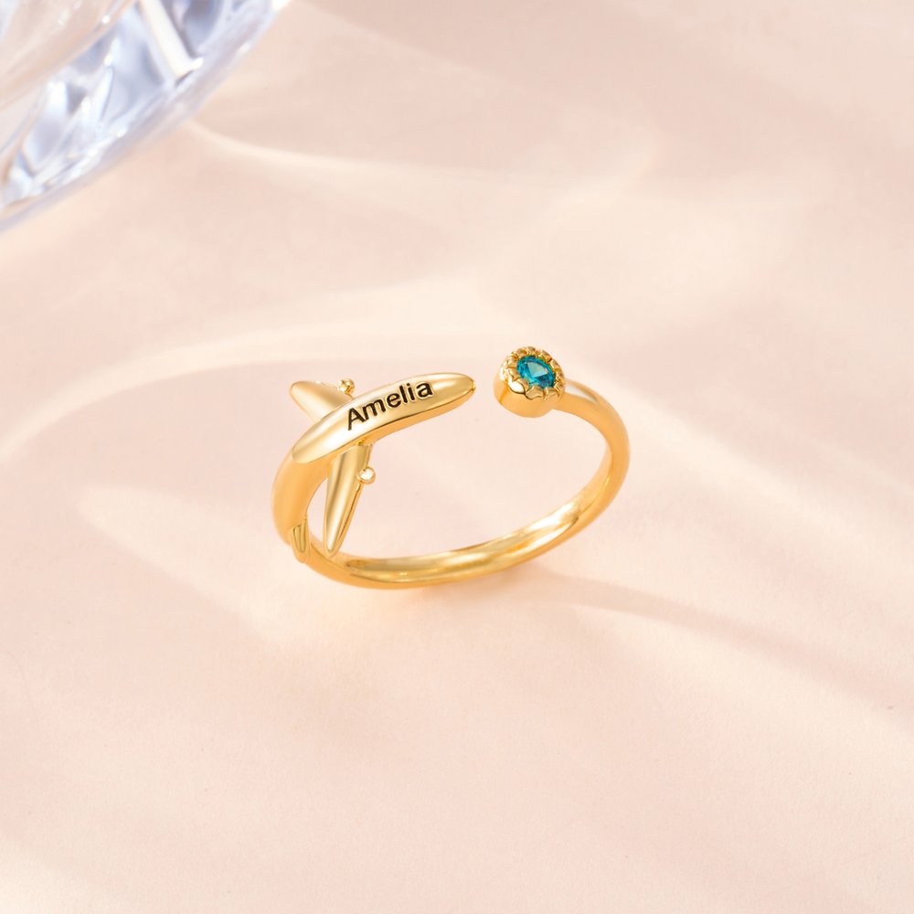 Centreed around an aircraft silhouette, this design combines birthstones with engravable elements to blend aviation-inspired recognition with personal customization. The three-dimensional plane shape visually evokes the aviation theme, while the embedded birthstone lends the ring unique commemorative significance—matching the wearer's birth month with a dedicated gemstone. Personalised engravings, such as airport codes or city names, can also be added.