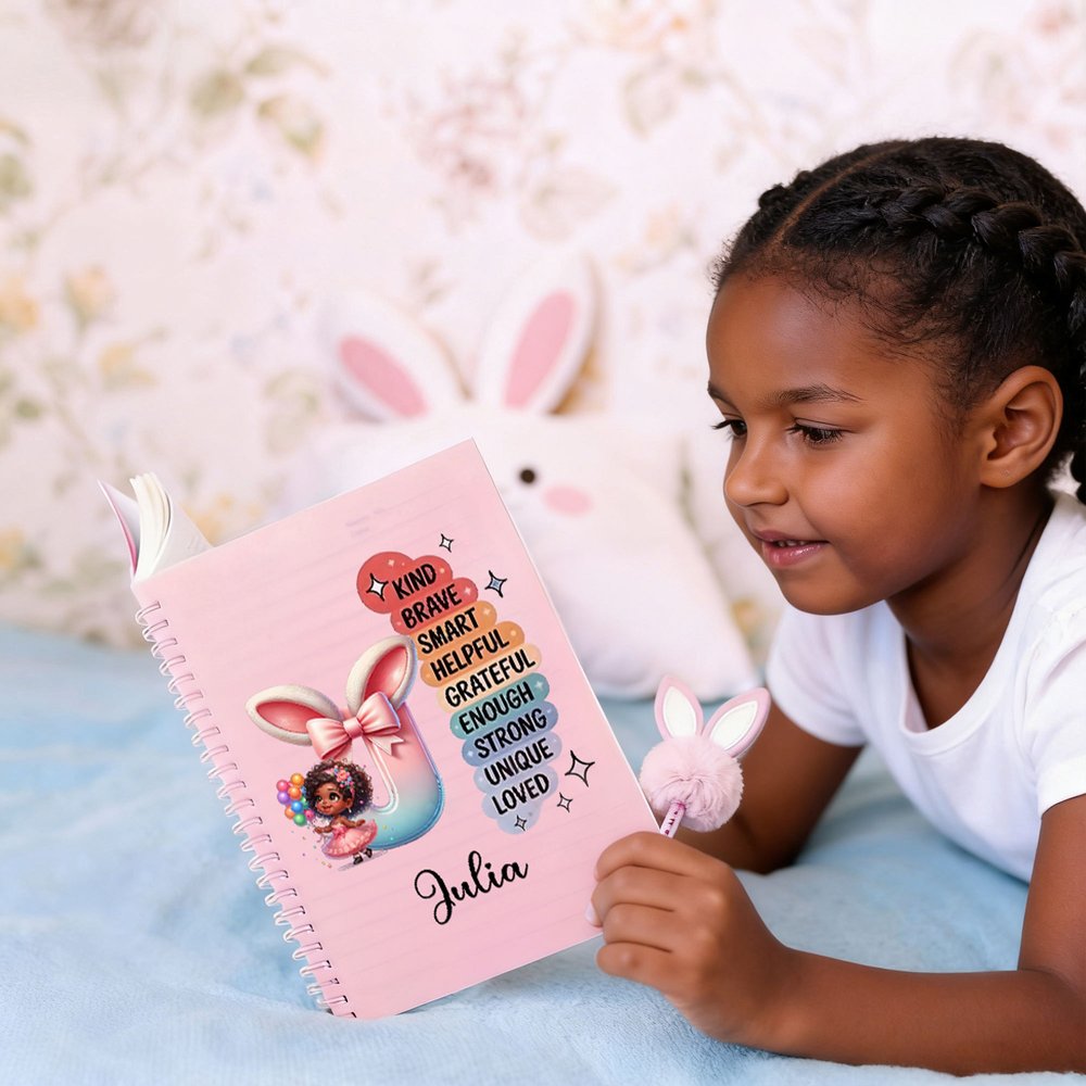 The notebook cover features an Easter-themed design with a cartoon Black girl, fresh, cute, and full of childlike fun. It can be customized with names and initials, adorned with bunny ears and bows to showcase a joyful holiday atmosphere. Nine unique encouraging words, including Kind, Brave, Smart, etc., convey a positive emotional message.