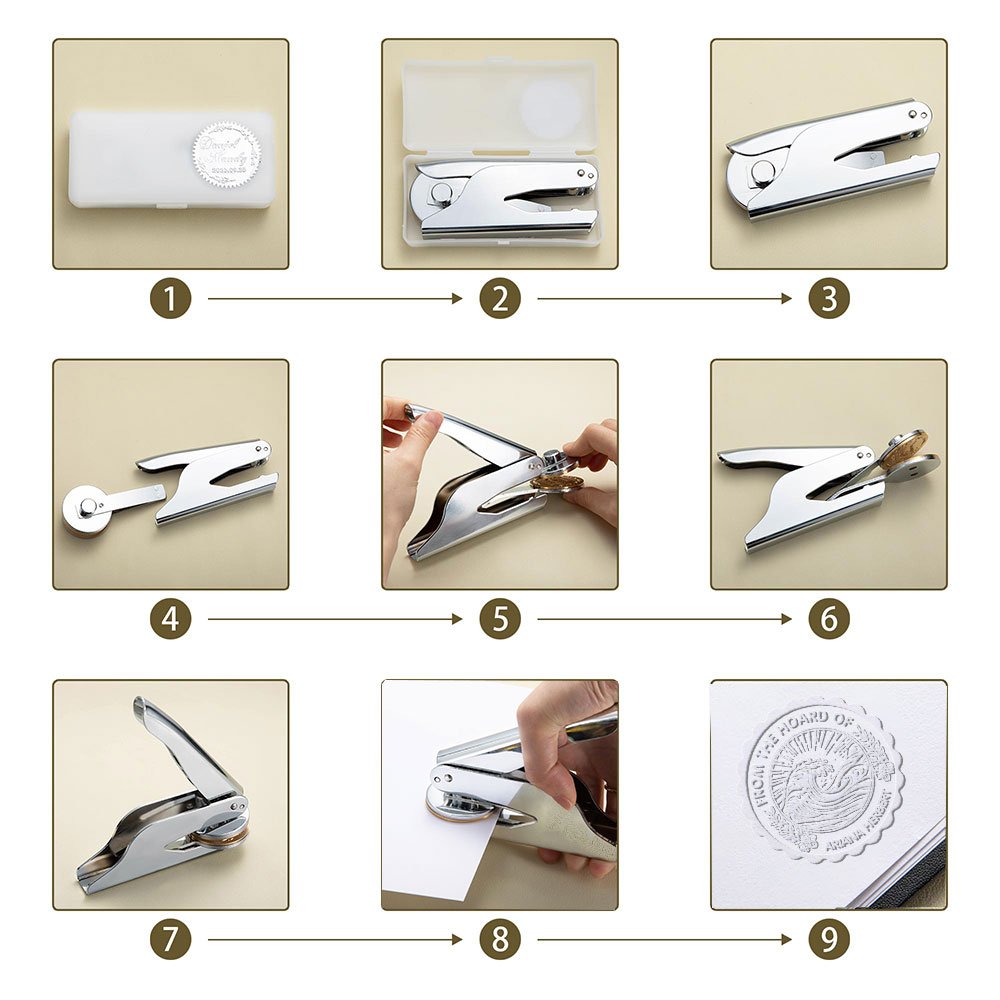 | Measurement: | Embosser - 4.13" x 4.13"(10.5cm × 10.5cm); Round Seal Diameter - 1.65"(4.2cm); Foil Sticker Diameter - 1.8"(4.5cm) |