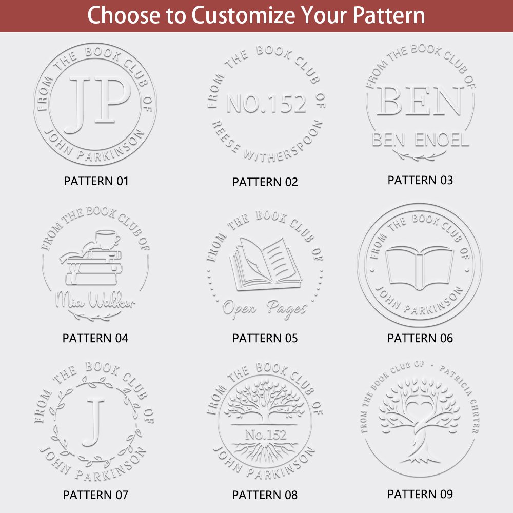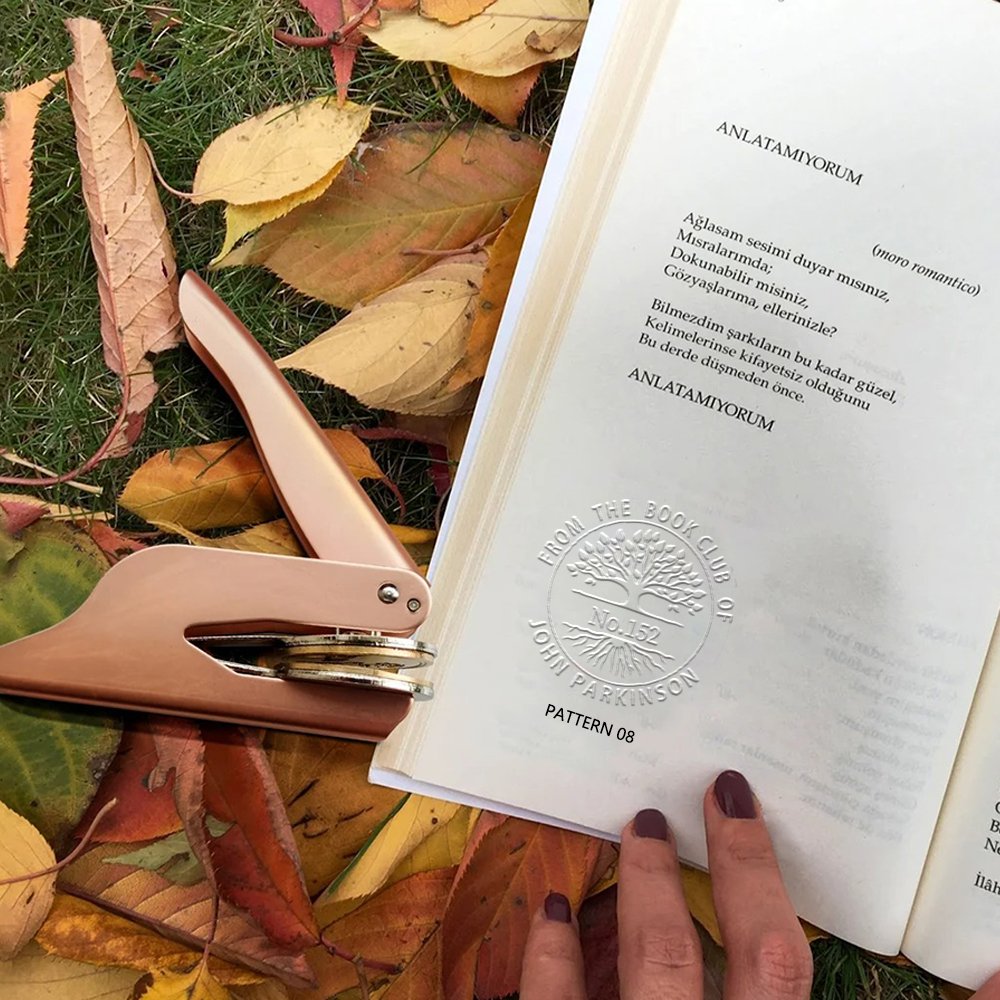 Showcasing a captivating book theme pattern with elements like open books, a knowledge tree, and a cozy reading corner, this embosser adds enchantment and sophistication to your collection. Personalise it with your name, initials, or a special phrase to create a unique identity for your books, reflecting your individuality as a reader.