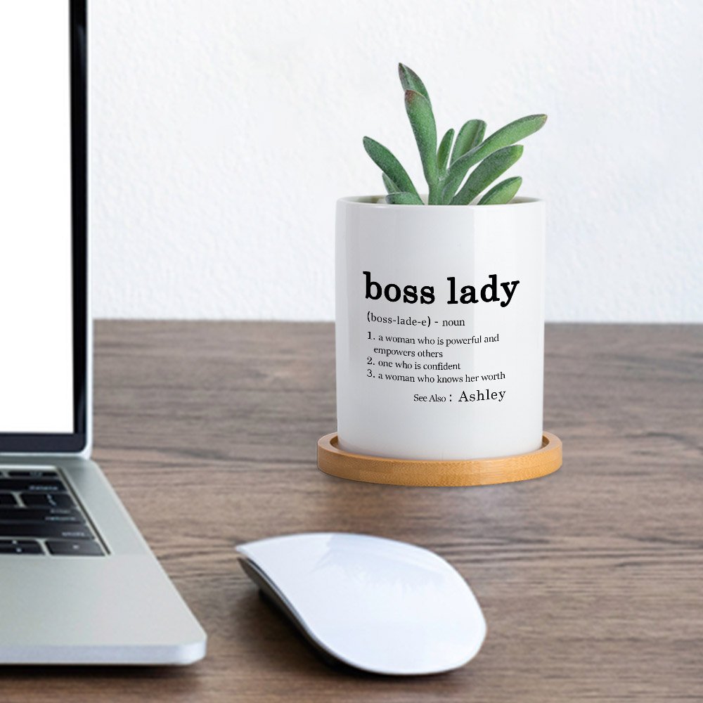 This ceramic plant pot is beautifully Personalised with the definition of "Boss Lady," celebrating the strength, leadership, and grace of women in power. The sleek, modern design is perfect for decorating any workspace or home office.