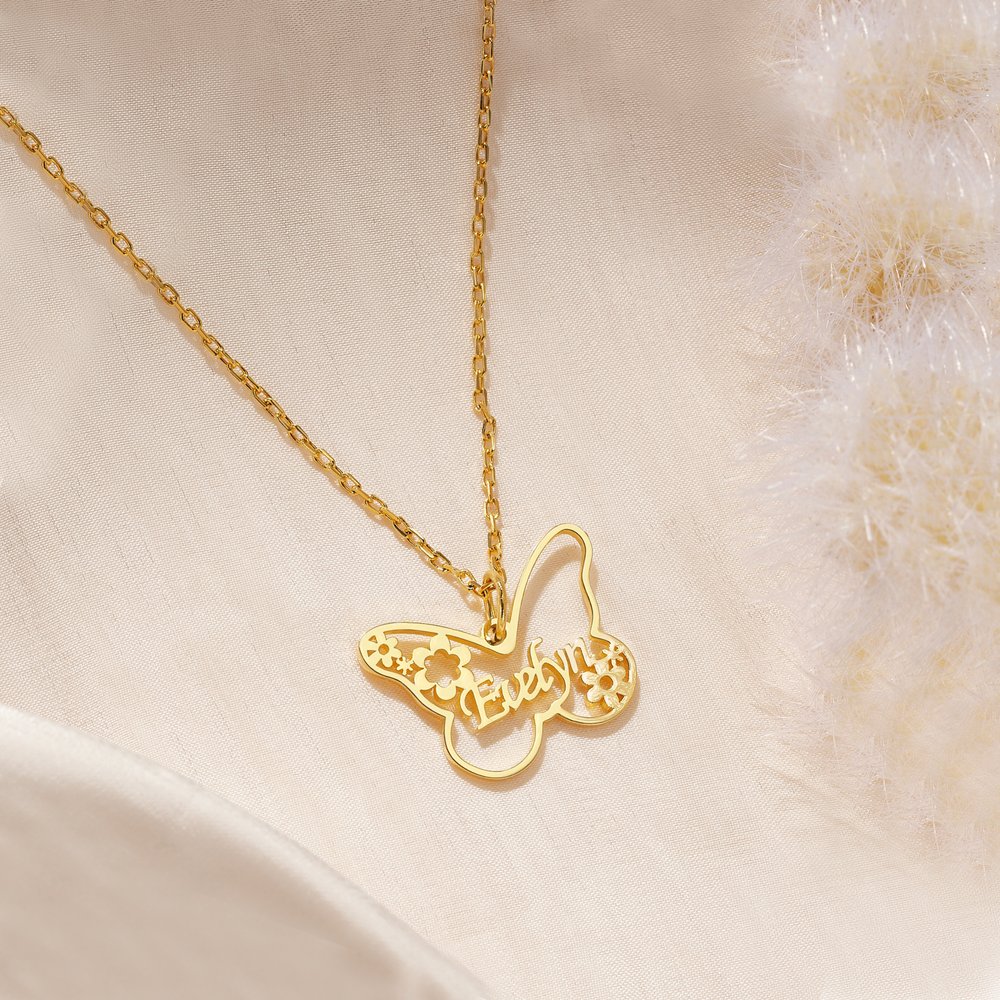 This necklace features an ethereal butterfly and blooming flower as design elements, skillfully blending the beauty of nature with artistic ingenuity. The intricately carved details of the butterfly's wings and petals create flowing, graceful lines. The Personalised design, which can be customized with a name, not only showcases unique taste but also imbues each piece with its own unique emotional imprint.