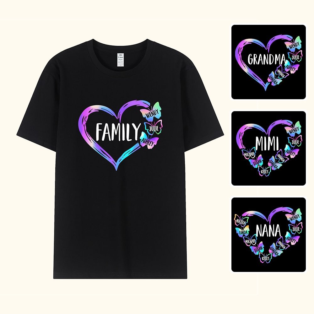 Personalised Gradient Butterfly Heart Design T-shirt with 1-10 Family Names Mother's Day Birthday Gift for Mom Grandma
