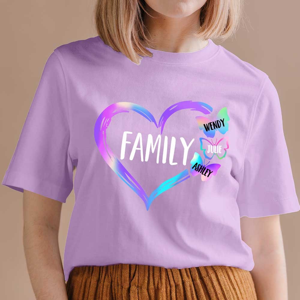 Our T-shirt printing butterflies and heart pattern with a title or name in the middle. Not only can you customize the title on your shirt, but there are also butterflies' numbers and names for you to customize! Using these beautiful butterflies to represent each family member in the home signifies that the family will always be together, united, and loving forever.