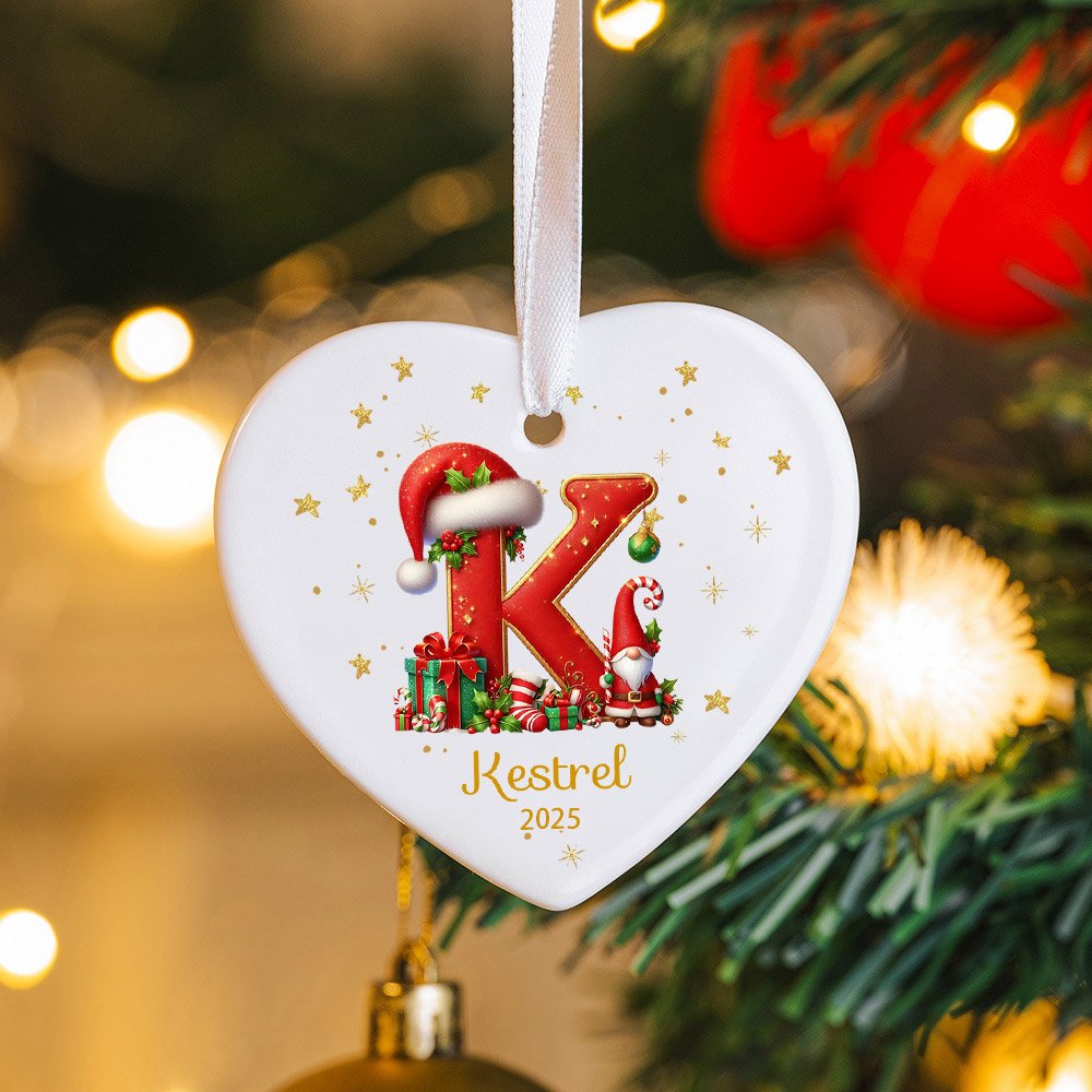 The ornaments prominently display large, bold initial letters, which can be customized according to your preference. Surrounding the initials are charming Santa hats, holly leaves, and gift-giving Santa Claus, creating a perfect Christmas - themed look. The use of red and green colours and gold accents enhances the festive atmosphere. The background of the ornaments is adorned with tiny, golden snowflakes and stars, which give a magical and wintry feel.