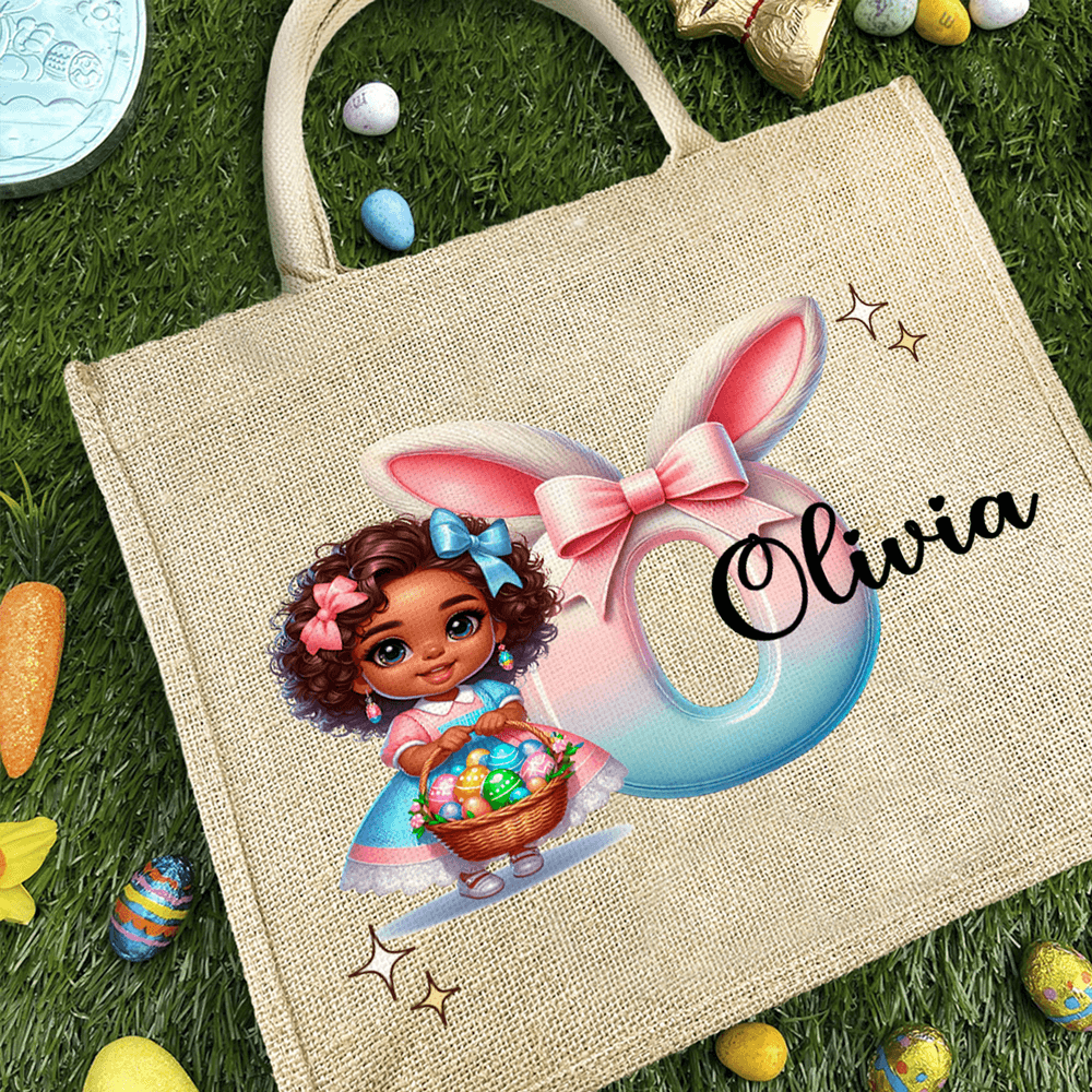 Featuring an adorable cartoon Black girl character, this tote is paired with a customizable initial designed with Easter bunny ears and a personalised name. Thoughtfully created to celebrate representation and individuality, the pink-and-blue gradient initial incorporates classic Easter elements such as bunny ears and bows. Set against the natural texture of jute, the design creates a vibrant spring holiday atmosphere filled with charm and a sense of celebration.