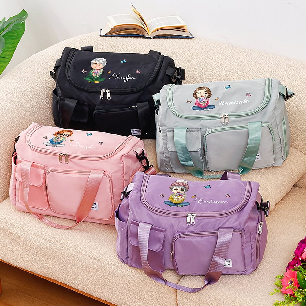 This Personalised weekend bag features a charming cartoon character design and a bouquet of freely matchable birth flowers that can represent family members or friends. It is a perfect gift that reflects personality and love. You can also customize the recipient's name on it.