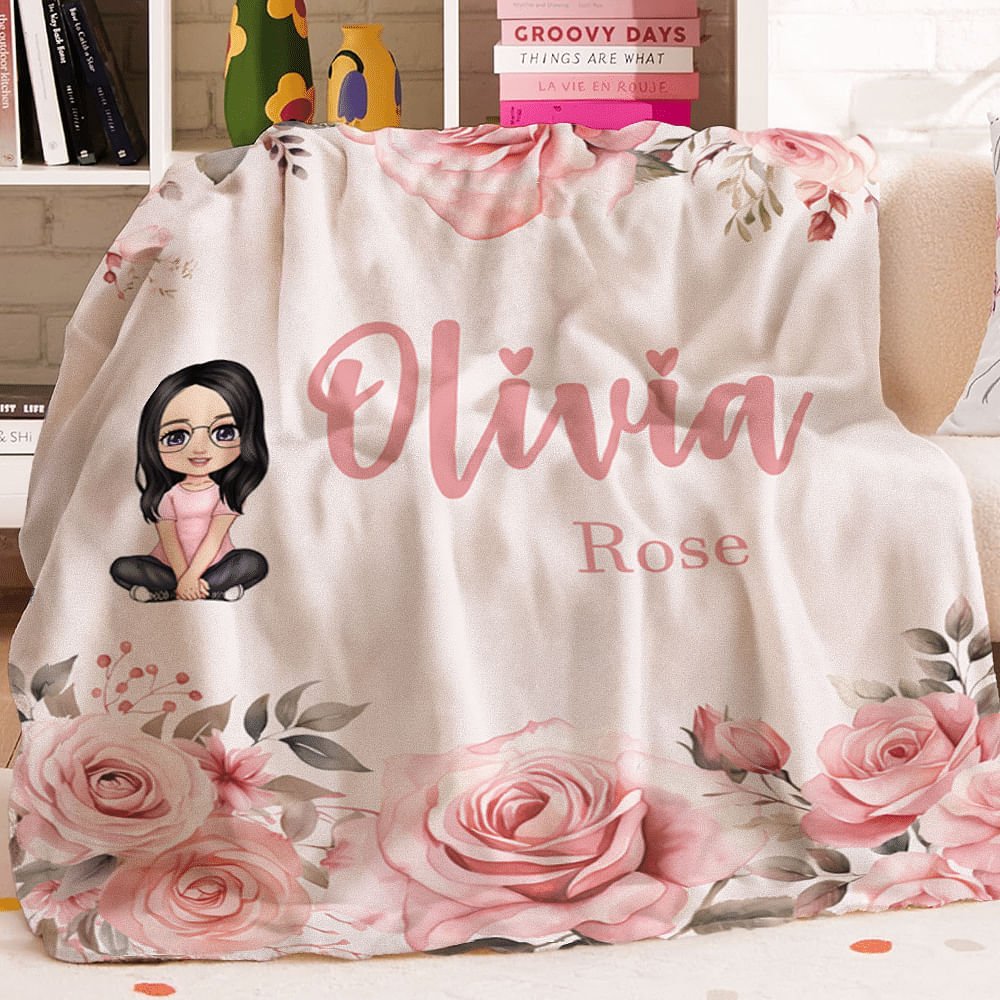 Personalised Cartoon Character Floral Design Soft Throw Blanket with Name Home Decor Birthday Christmas Gift for Kids Family