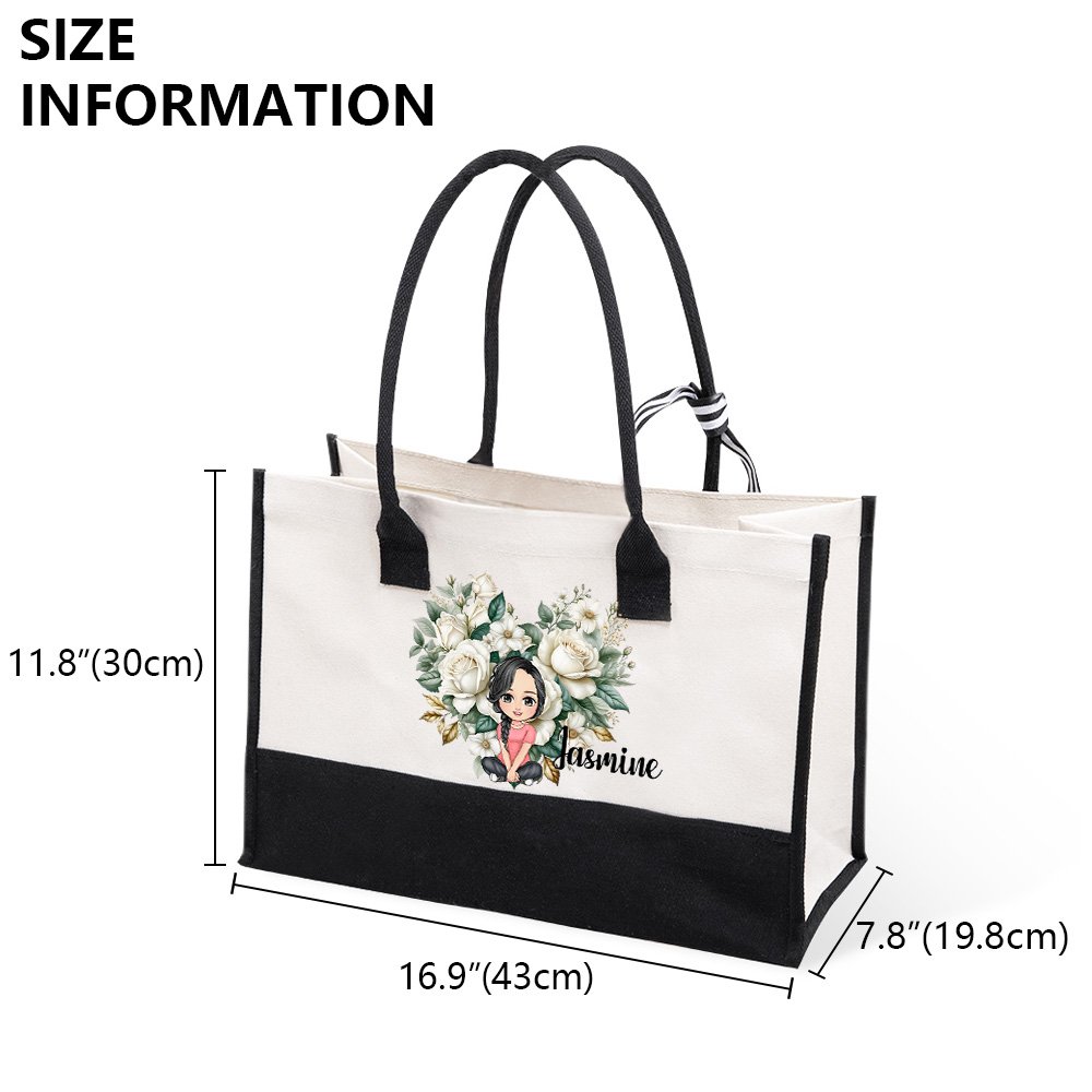 What makes this handbag stand out is its personalization options. This unique bag features a charming cartoon character design and a heart-shaped floral design, full of personality and fashion. It can be customized with your name, with one-sided or double-sided printing. This thoughtful detail turns a simple handbag into a precious souvenir.