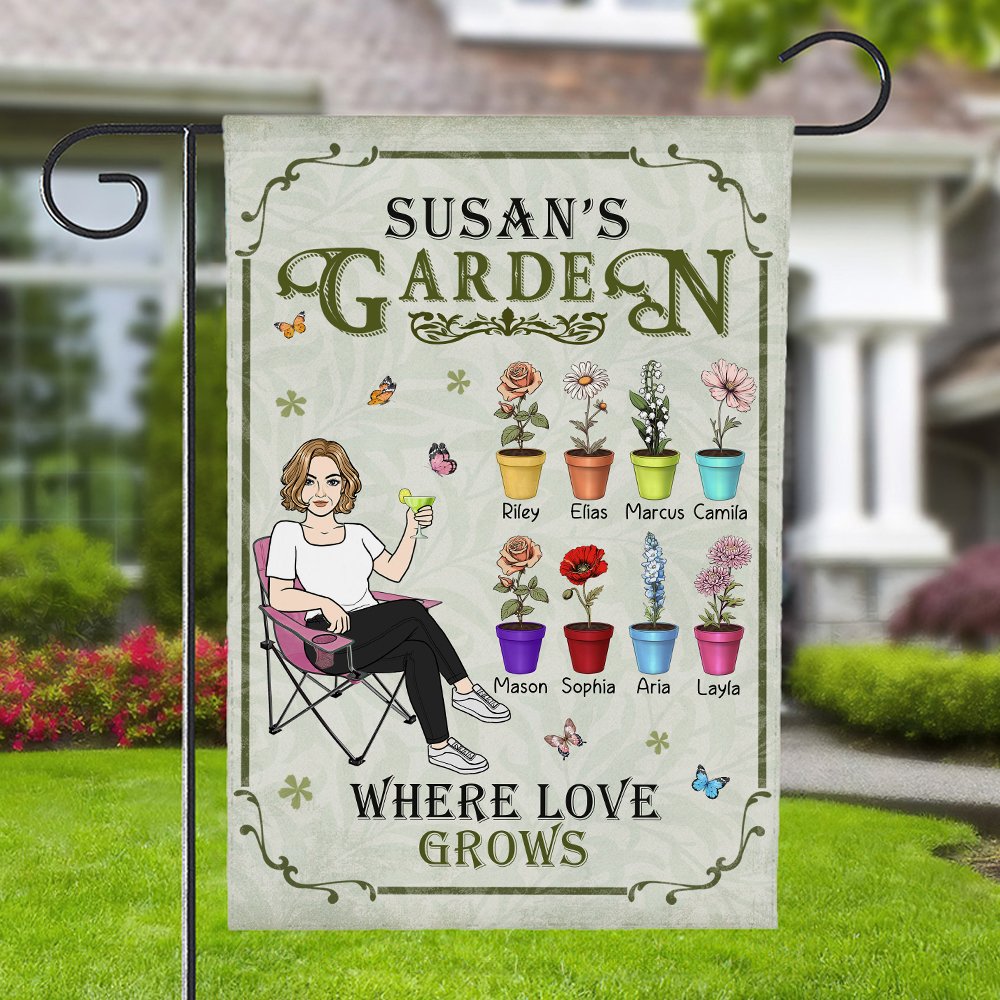 Celebrate your love of gardening with this Personalised cartoon-style garden flag featuring adorable characters, blooming flowers, and potted plants. Not only can you Personalise your birth month with your birth flowers, you can also Personalise your name to add personality and warmth to any outdoor space, perfect for surprising parents or grandparents on special occasions.