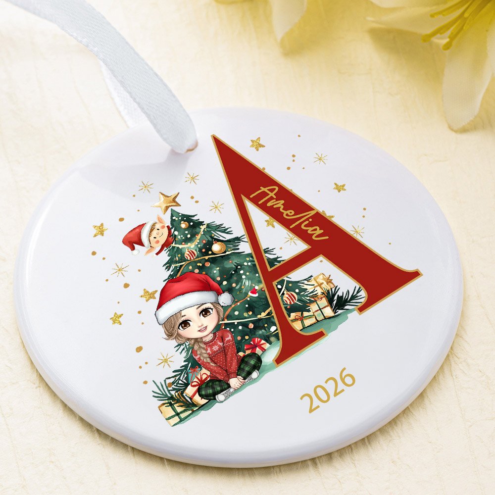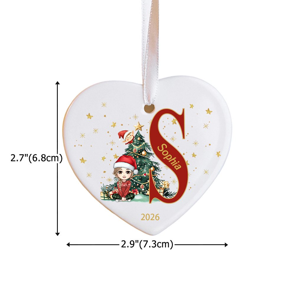 Available in two charming shapes - classic round or sweet heart-shaped ceramic. Each design features adorable cartoon characters gathered around a festive Christmas tree, with personalised initial and name customization.
