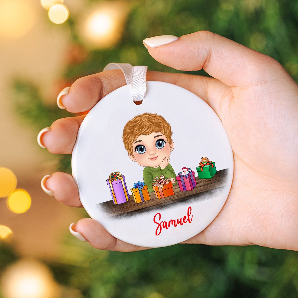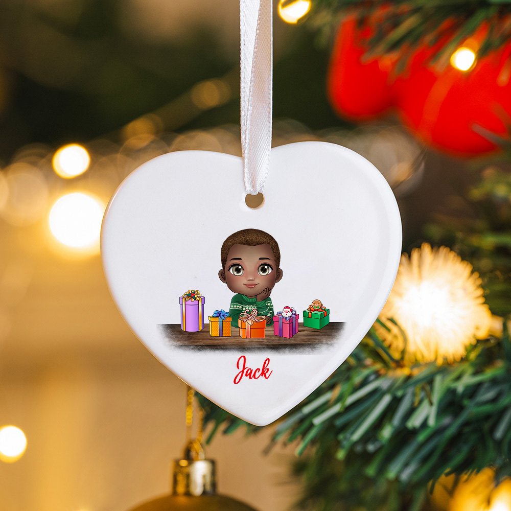 This ornament features cute cartoon children with Christmas gifts on the table, complete with a top hat or reindeer headband, creating a festive atmosphere. We offer 2 gender options; you can add names to make it a unique and Personalised accessory. Every child will love it!