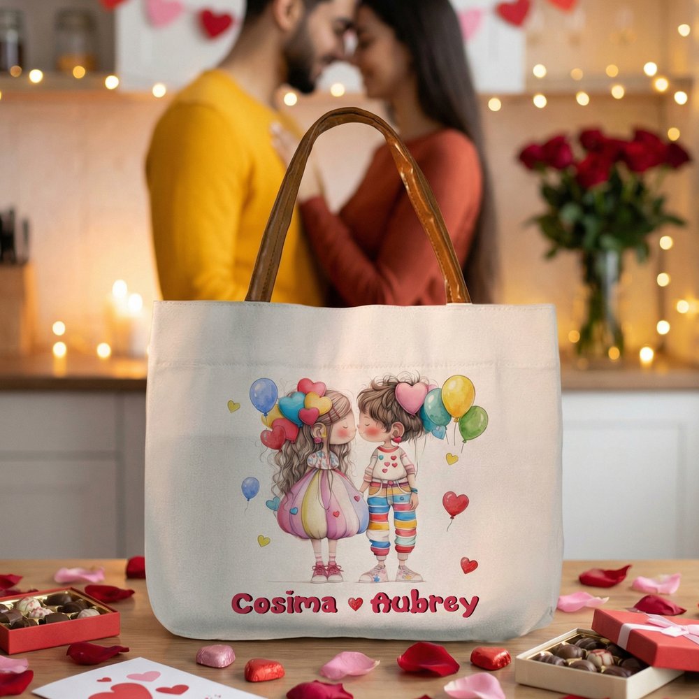 This tote bag features a whimsical watercolour cartoon design of a cute couple blowing heart bubbles, surrounded by balloons and hearts, paired with custom names printed in a sweet red font. The Valentine’s-themed elements blend playful charm with personalization, turning a basic tote into a unique accessory that reflects your romantic bond.