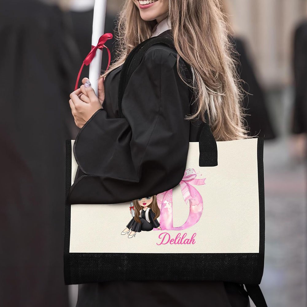 This tote bag features the image of a cartoon graduate girl and the corresponding bow initial design. You can customize it according to your personal preference, to show the unique style and achievements of the graduates. In addition, you can customize your name on the tote bag to make it even more distinctive.