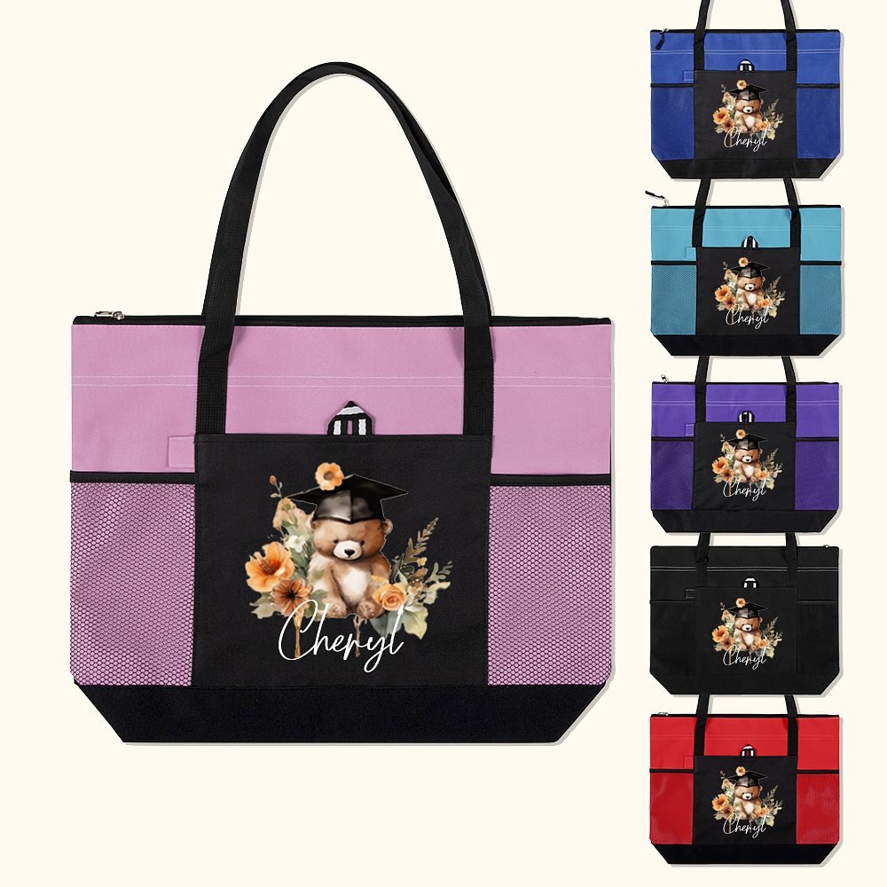 Personalised Cartoon Graduation Hat Bear Floral Large Zippered Tote Bag with Name Birthday Graduation Celebration Appreciation Gift for Women