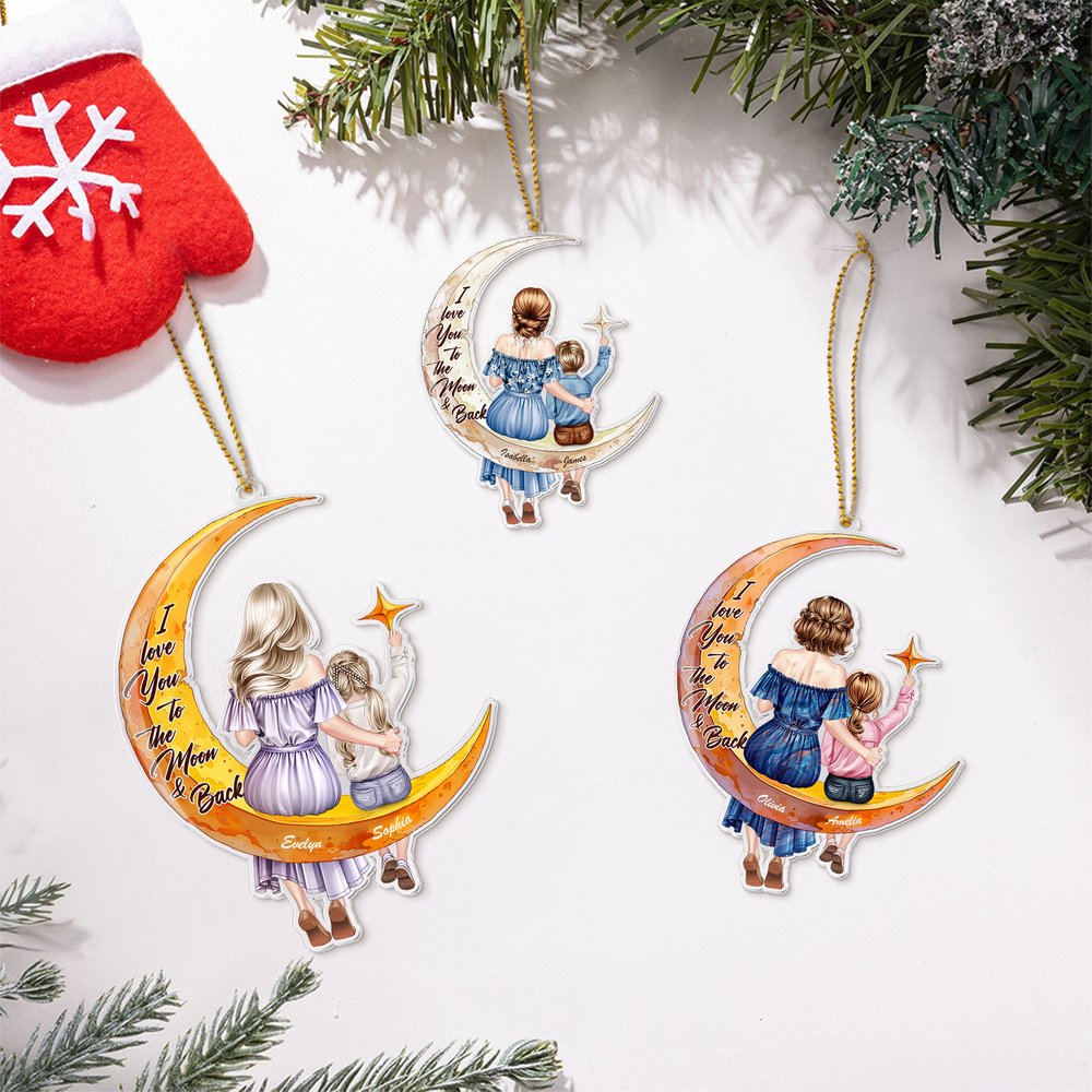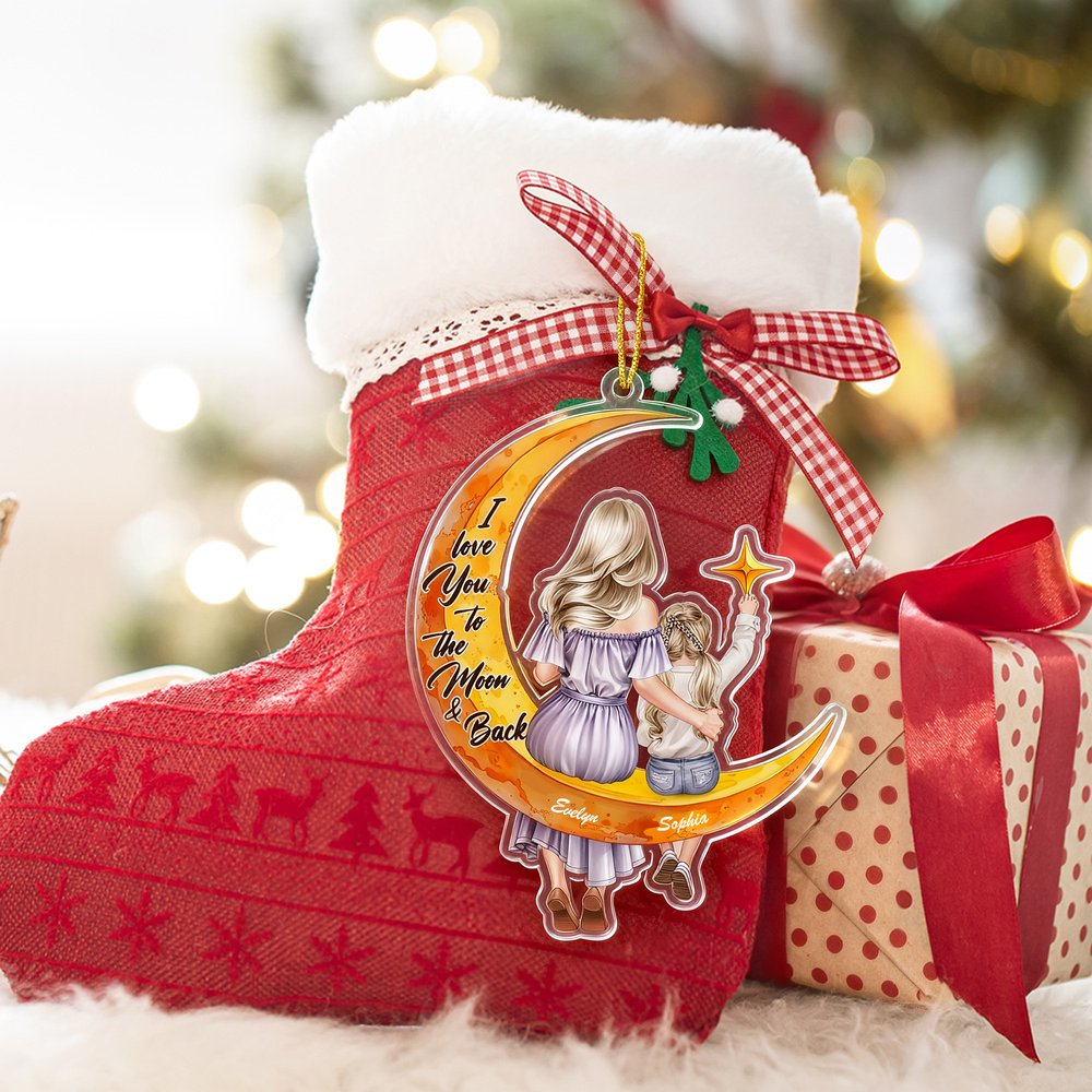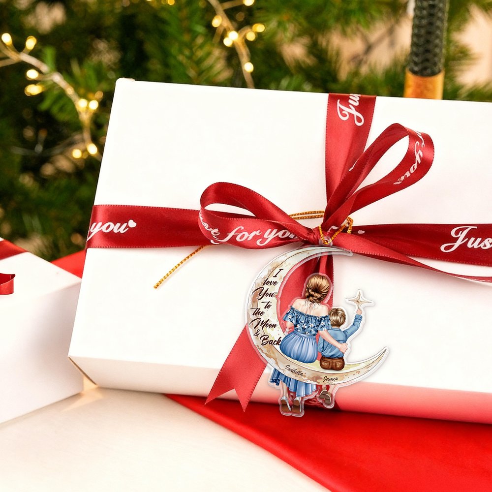 Made from high-quality acrylic, the ornament is sturdy yet lightweight. It features a polyester golden lanyard for easy hanging. The printing process ensures vibrant, long-lasting colours and sharp details of the mother-child scene, moon, star, and custom names. It’s durable enough to be a yearly holiday keepsake.