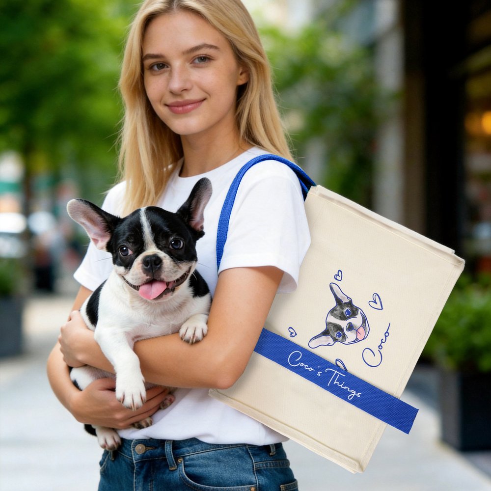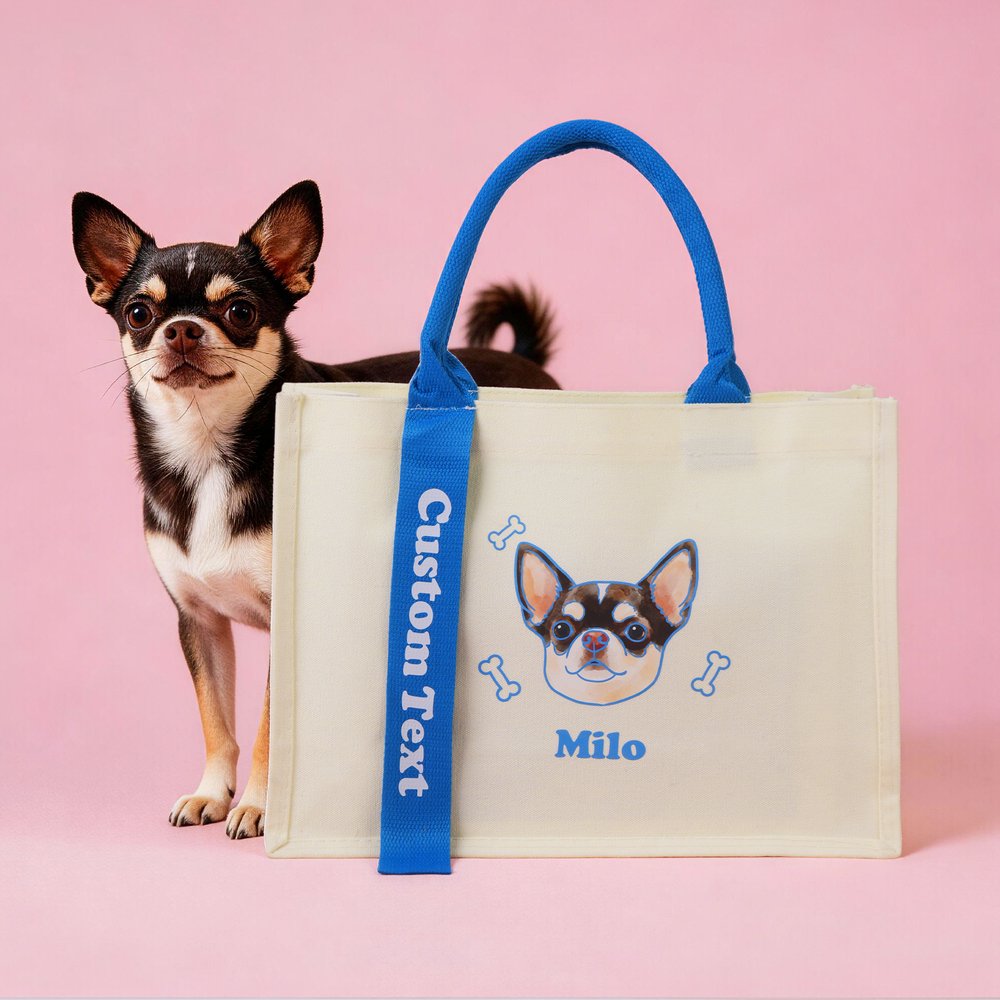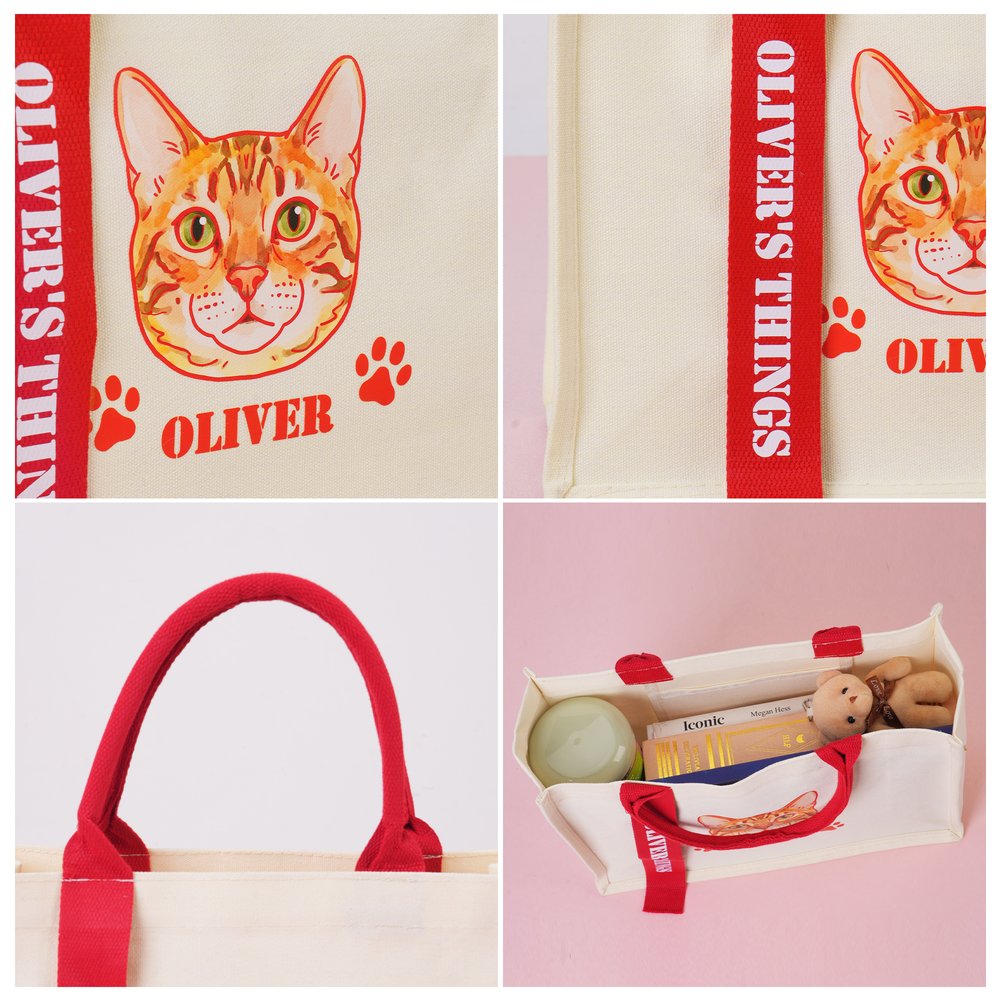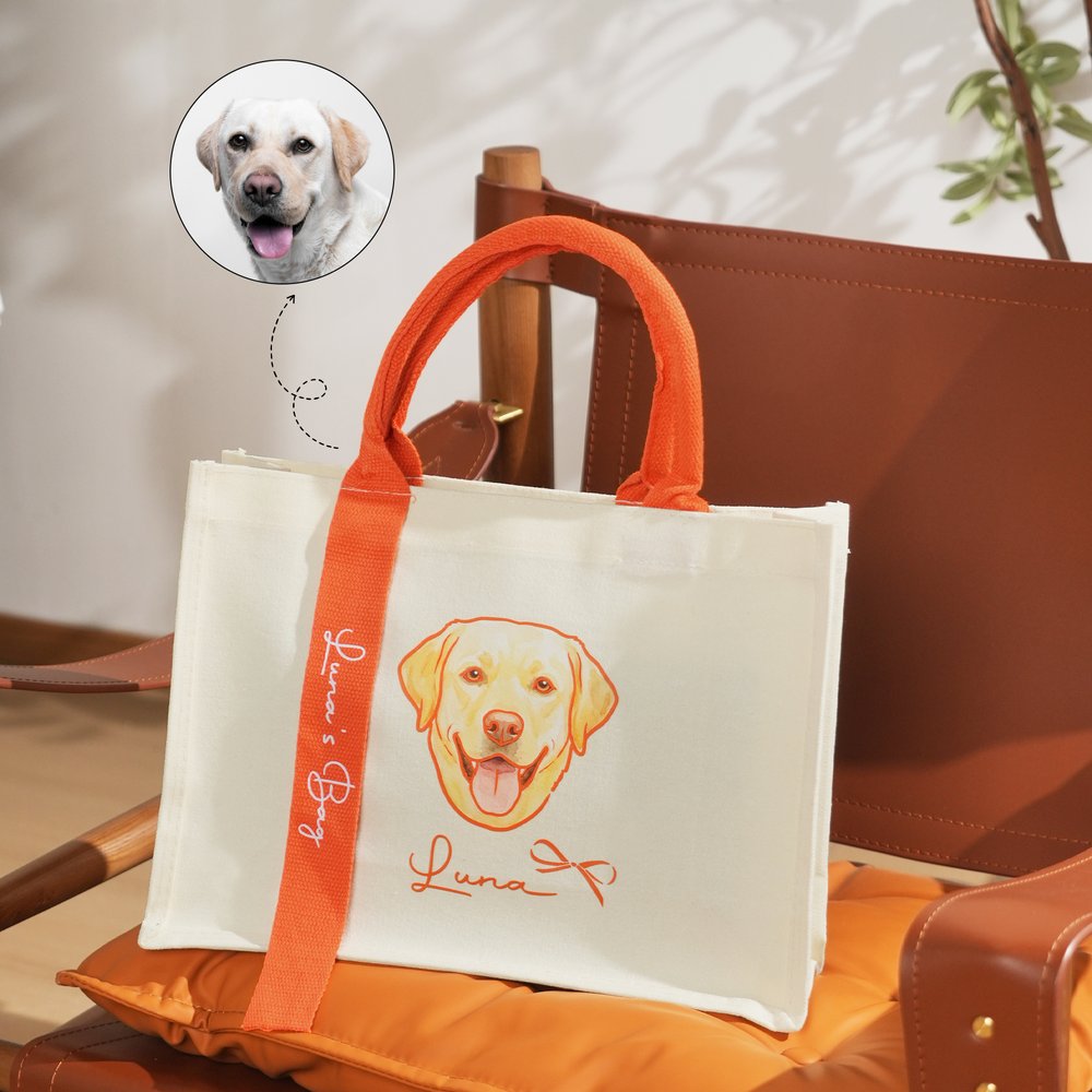 This tote bag features a hand-drawn cartoon pet portrait as its core highlight. You can upload a photo of your dog or cat, and we will transform it into a delicate and cute cartoon-style pattern, along with customized names and decorative elements. The bag uses an off-white canvas base, paired with colourful, contrasting handles and ribbons, making each bag a one-of-a-kind pet keepsake—both a practical accessory for daily outings and a warm carrier for cherished pet memories.